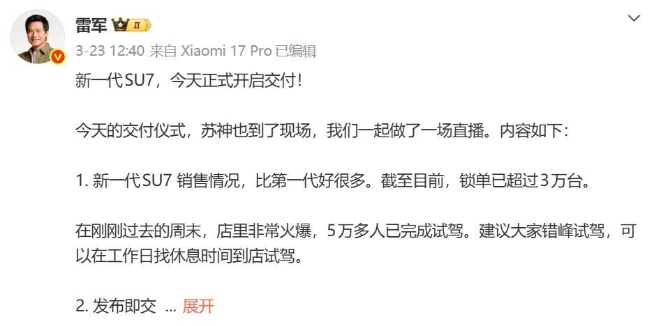而且在3月23日,雷军表示新一代SU7已经开启交付,在2026年这个新能源市场增速放缓、竞争白热化的节点,这个开局数据,含金量确实不低。
