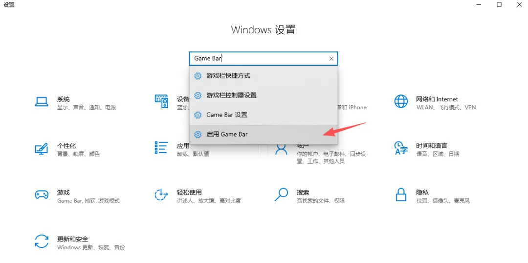 这里我要强调一下,这个软件默认是关闭的,直接打开不一定能用,需要自己进行开启。开启的方式如下:开始菜单→设置(或者快捷键Win+R)→搜索Game Bar,直接选择启用Game Bar也行,也可以选择Game Bar设置,进入设置界面。