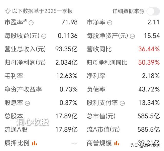 今年一季度,营业收入93.35亿元,同比增长36.44%;归属于上市公司股东的净利润2.03亿元,同比增长50.39%。