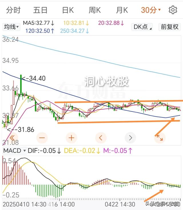 30分钟图中,k线在区间震荡,如跌穿120均线,以及下沿,向下的概率增大,MACD死叉。