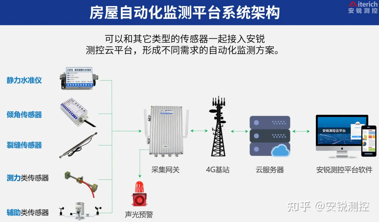 当前,我国对房屋安全的鉴定大多采用传统的人工定期观察和测量方式。在检测技术与手段不断创新的过程中,尤其是与电子信息、物联网技术相结合后,房屋建筑的安全管理与监测的工作效率也得到了显著提升。深圳安锐科技通过结合危房监测的需求对结构健康自动化监测系统进行设计,实现对房屋地基不均匀沉降、房屋基础结构损坏、结构变形等现象进行长期在线监测,实时掌握老旧房屋的变形和重要结构损坏情况以及变化趋势。