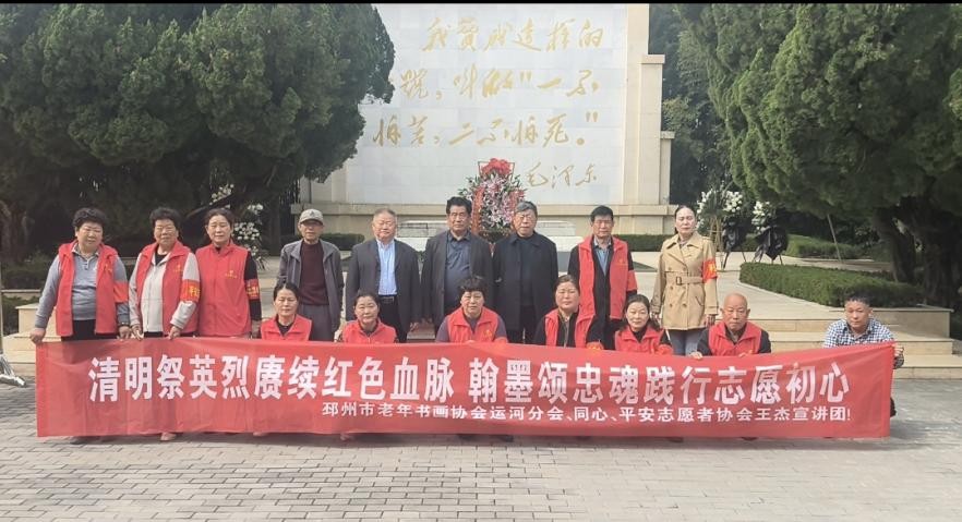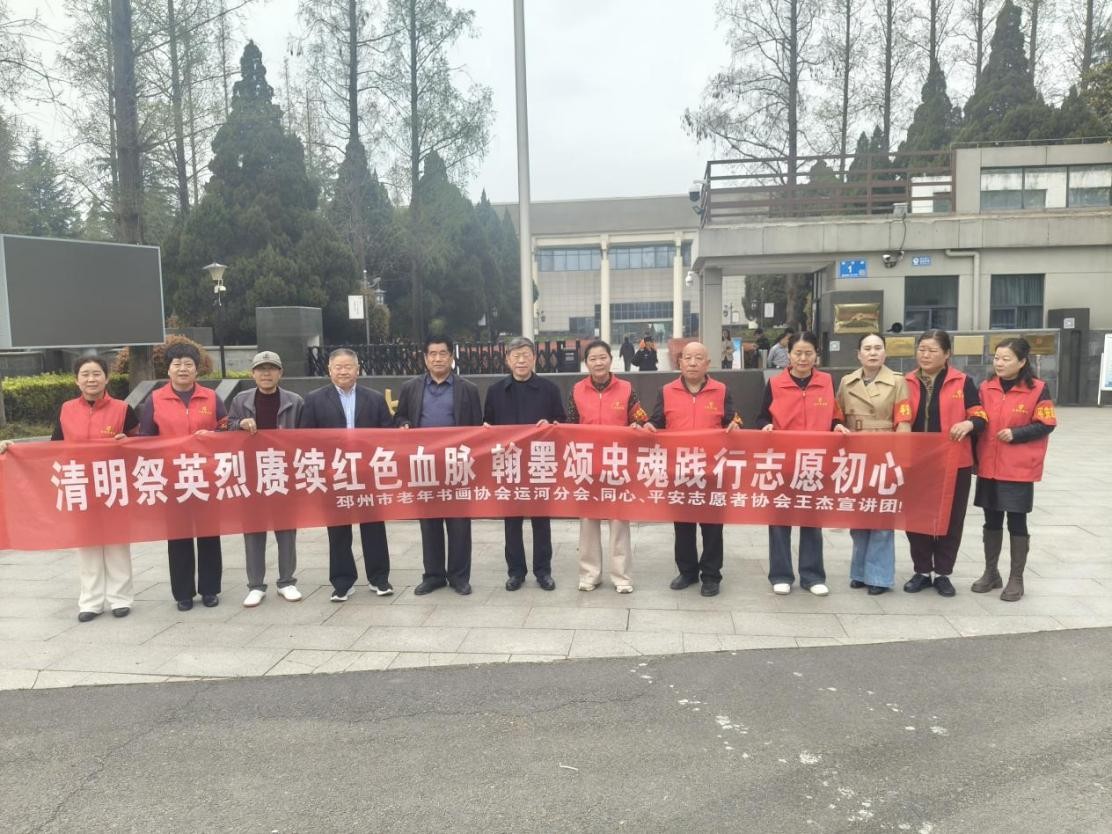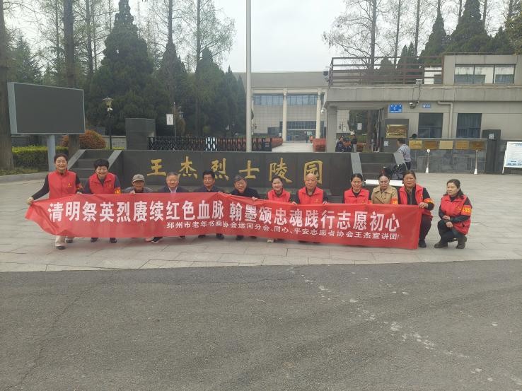 清明时节,细雨轻飘,哀思萦绕心间。为深切缅怀舍身救人的王杰烈士,传承和弘扬“一不怕苦、二不怕死”的伟大王杰精神,赓续红色革命血脉,2026年4月3日上午9时,邳州市老年书画协会运河街道分会、同心、平安志愿者协会王杰宣讲团,联合在王杰烈士陵园开展“清明祭英烈赓续红色血脉 翰墨颂忠魂践行志愿初心”主题活动。20余名书画爱好者与志愿者怀着无比崇敬的心情,走进庄严肃穆的陵园,以敬献鲜花、捐赠书画、瞻仰事迹、现场宣讲等形式,缅怀英雄功绩,践行志愿初心,让传统文化与红色教育深度交融,在清明时节厚植浓浓爱国情怀。