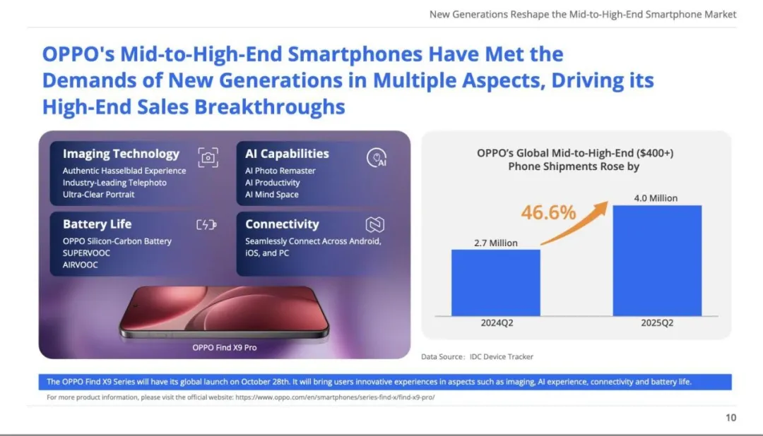 而且,OPPO手机的平均售价还在上涨,而且是全球排名前五的品牌中增长最快的。截至2025年第二季度,OPPO全球中高端手机(售价400美元以上)出货量同比增长46.6%。