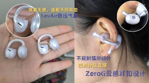 佩戴体验:设计独特,像小型头戴耳机的缩小版,连接部分用了柔性TPU材质,内置0.5mm形状记忆钛合金钢丝,能保持形状还能适配不同耳型。单耳重量约5.9克,戴起来很轻,长时间佩戴完全没有负担,甚至会忘记戴了耳机,和眼镜、帽子一起戴也不会冲突。