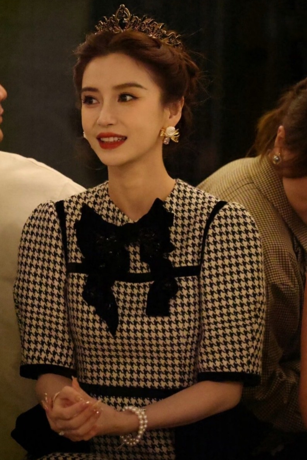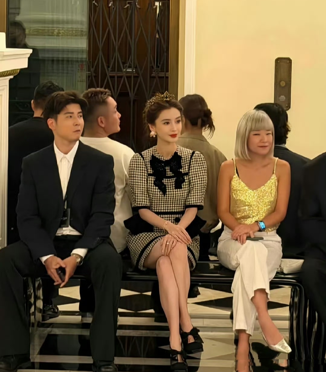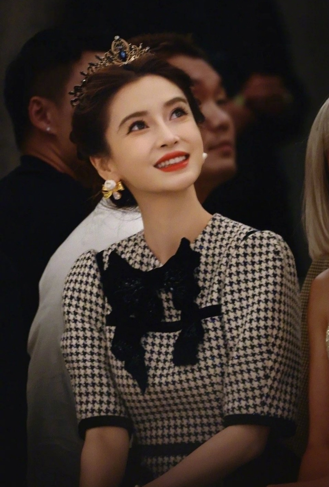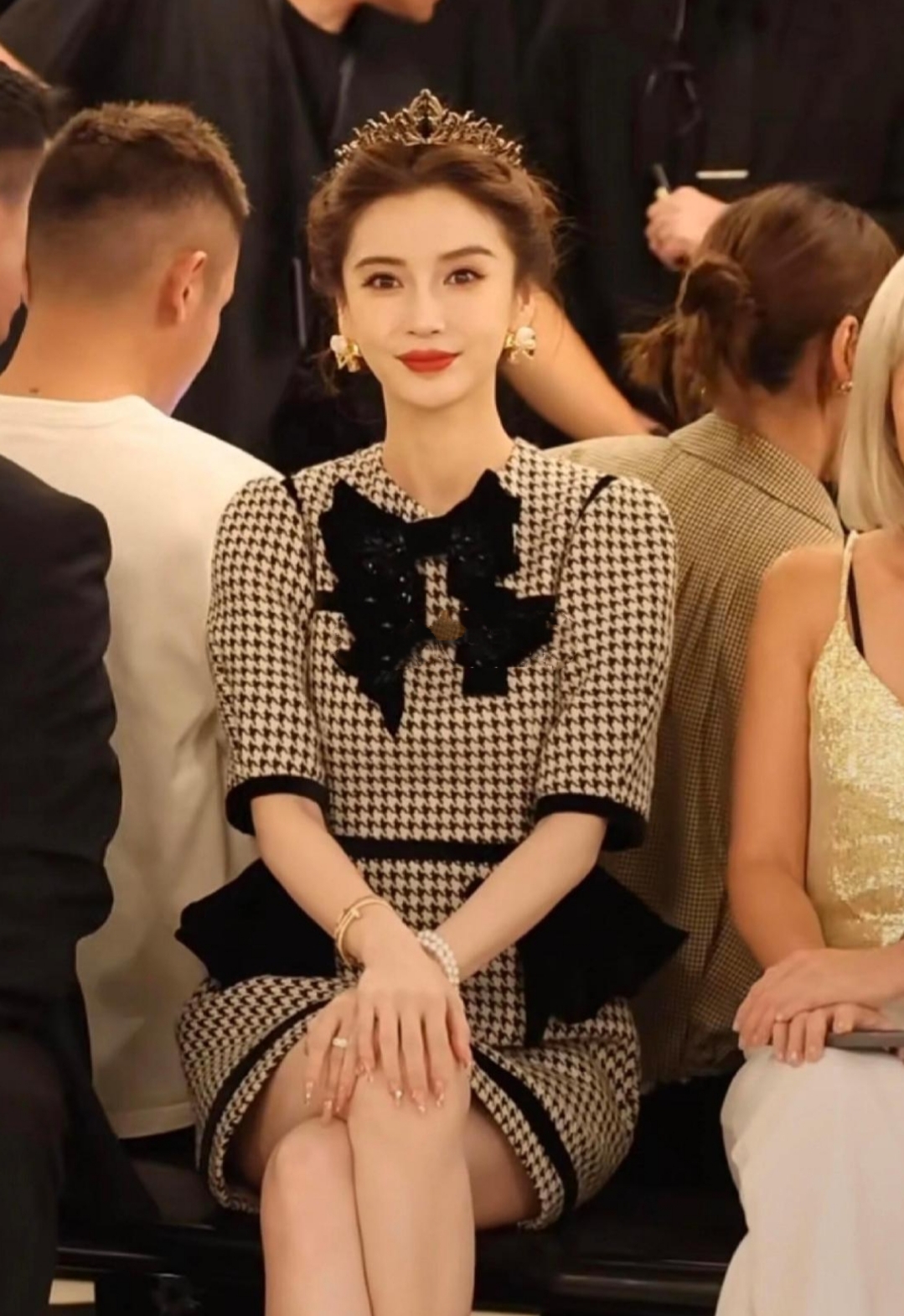 看秀当天,Angelababy的造型堪称“教科书级公主风”。她身着千鸟格套裙,经典的黑白格纹搭配收腰设计,既复古又显身材;最吸睛的当属头顶那顶钻石皇冠——由品牌定制,镶嵌数百颗碎钻,在灯光下闪烁如星河。搭配微卷长发与珍珠耳饰,整个人宛如从童话中走出的公主。生图曝光后,网友集体破防:“这皮肤状态,说是20岁我都信!”“皇冠一戴,谁与争锋?”更有时尚博主分析:“千鸟格+皇冠的组合,既保留了优雅感,又通过配饰强化了气场,baby的团队这次真的赢麻了。”