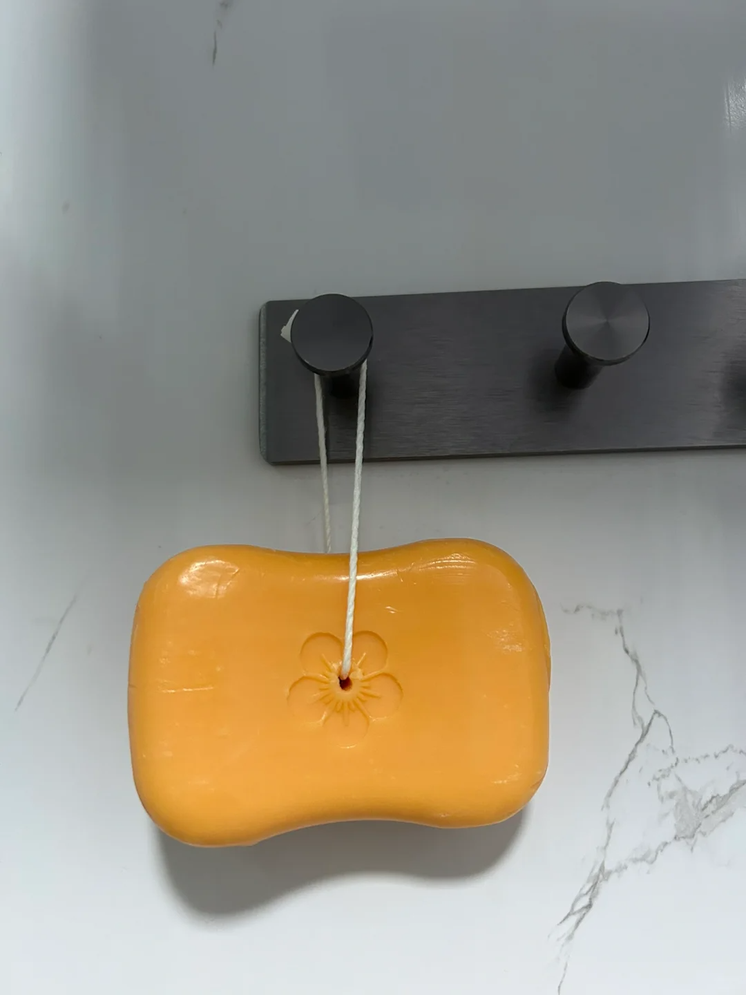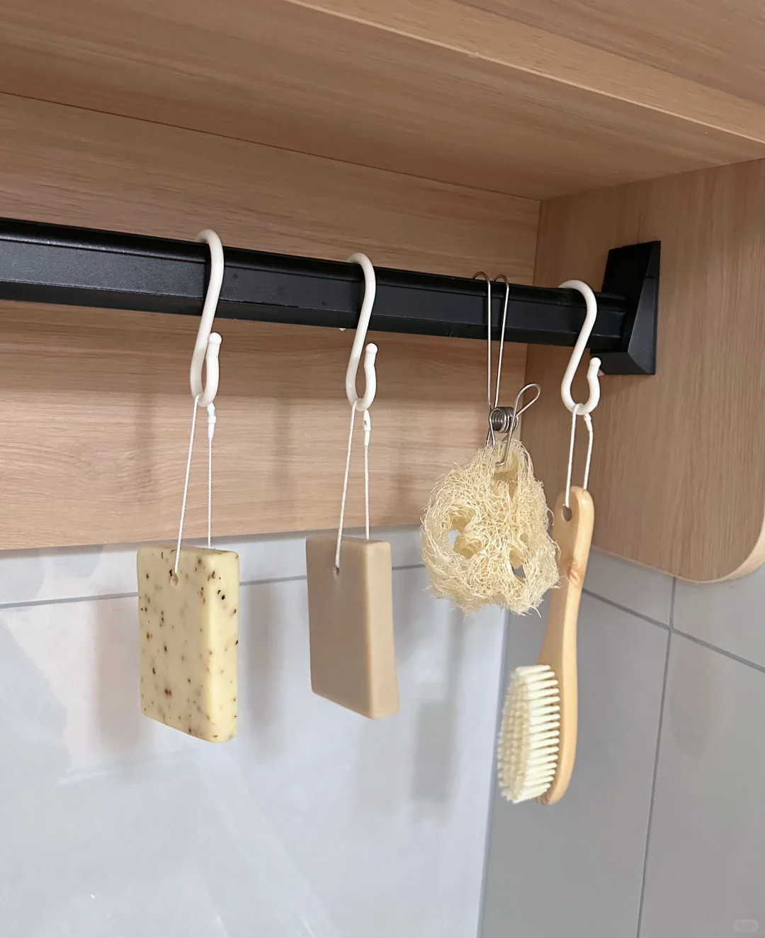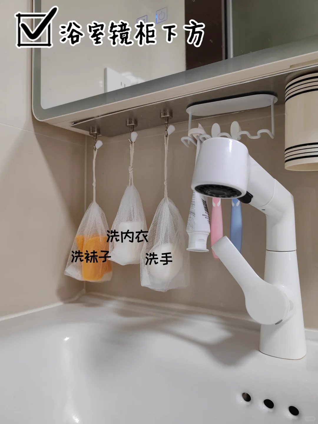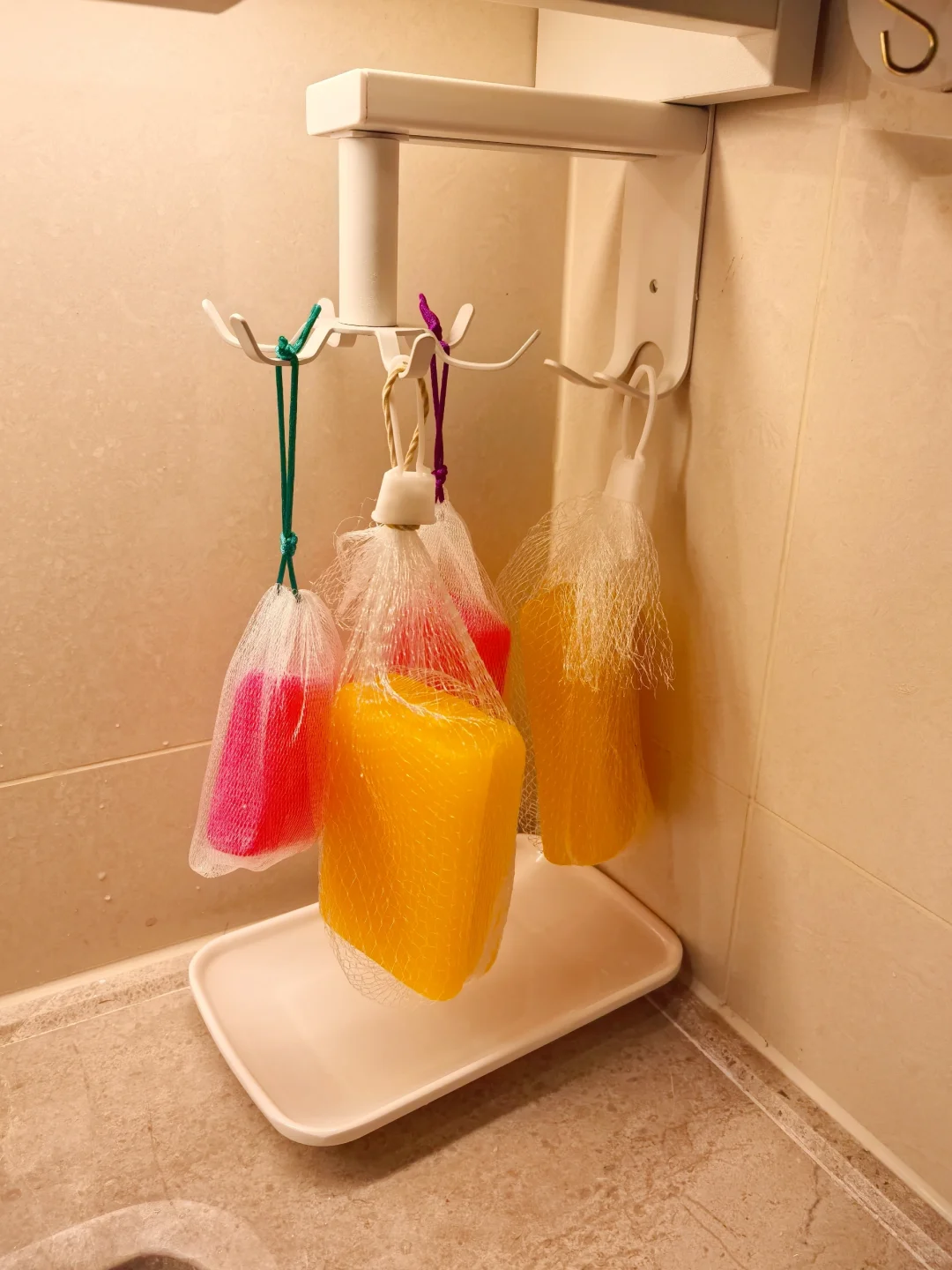 其实这个起泡网还挺好用的,如果你没有可以在网上花几毛钱就能买一个,然后再找一个挂钩,把香皂放在里面就可以挂在墙上收纳了。