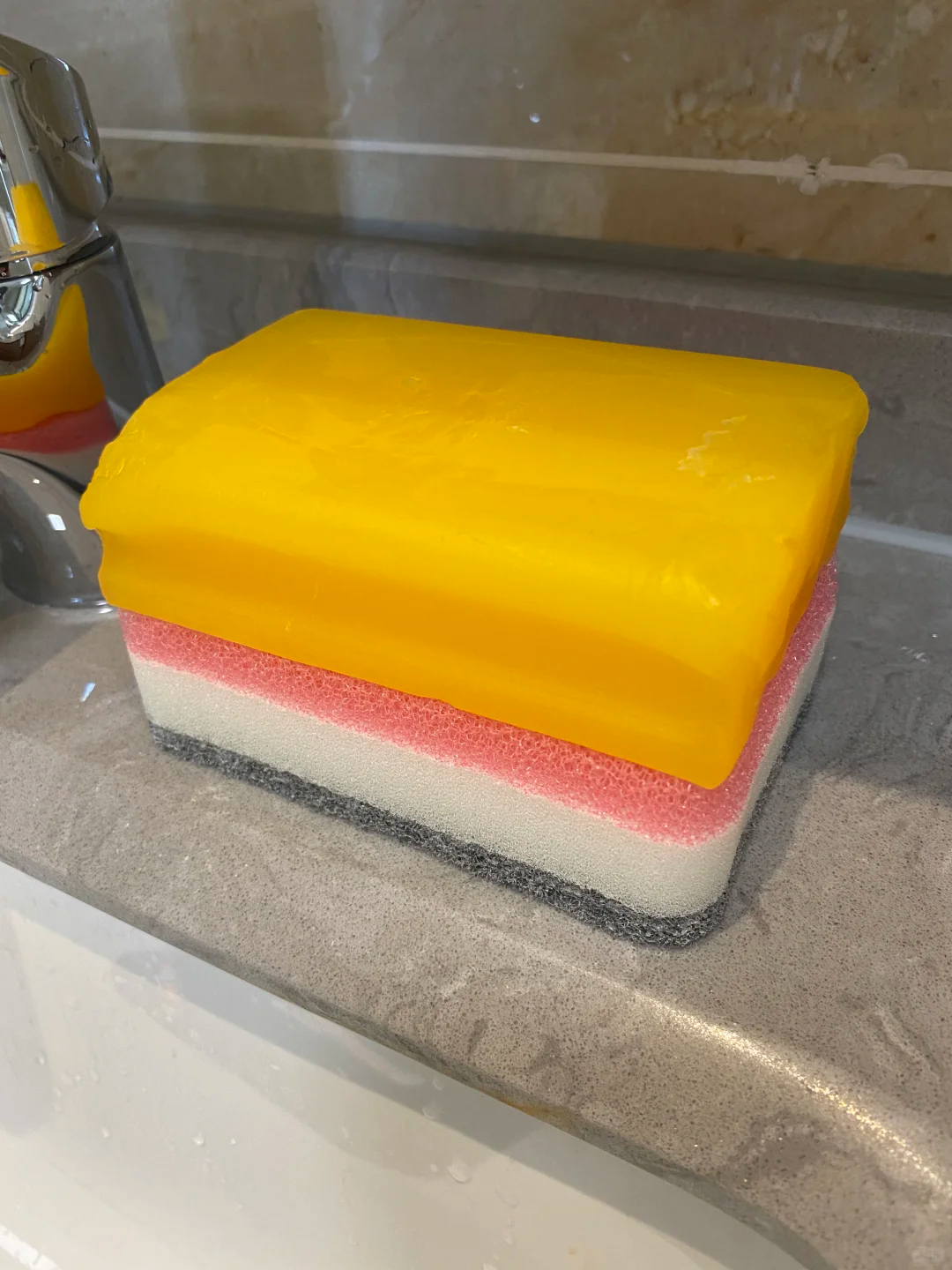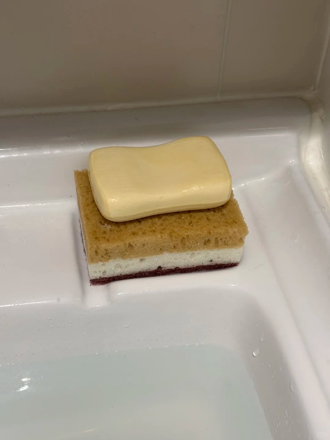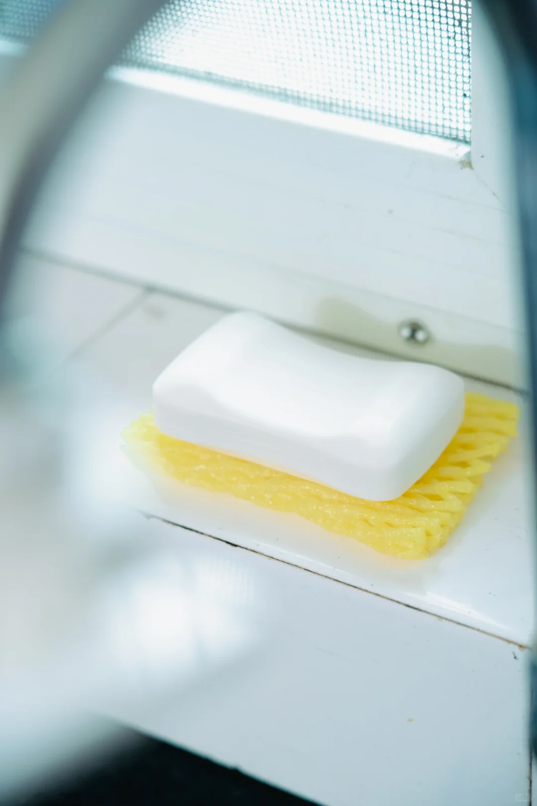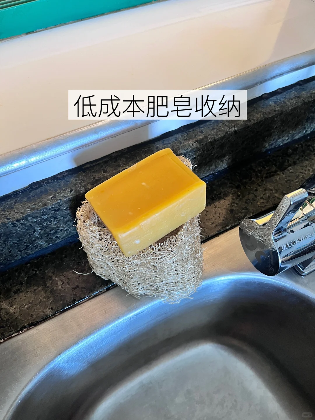 反正我们刷碗的时候就会买海绵擦,正好拿来一个收纳香皂,也不用额外花钱。只要把海绵擦放在水池抬上,然后再把香皂放在海绵擦上。