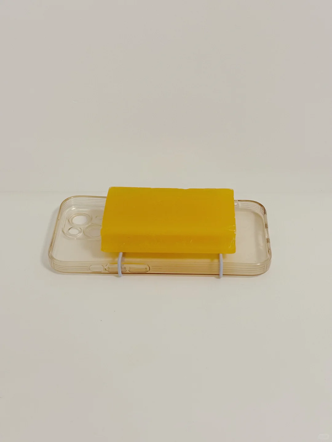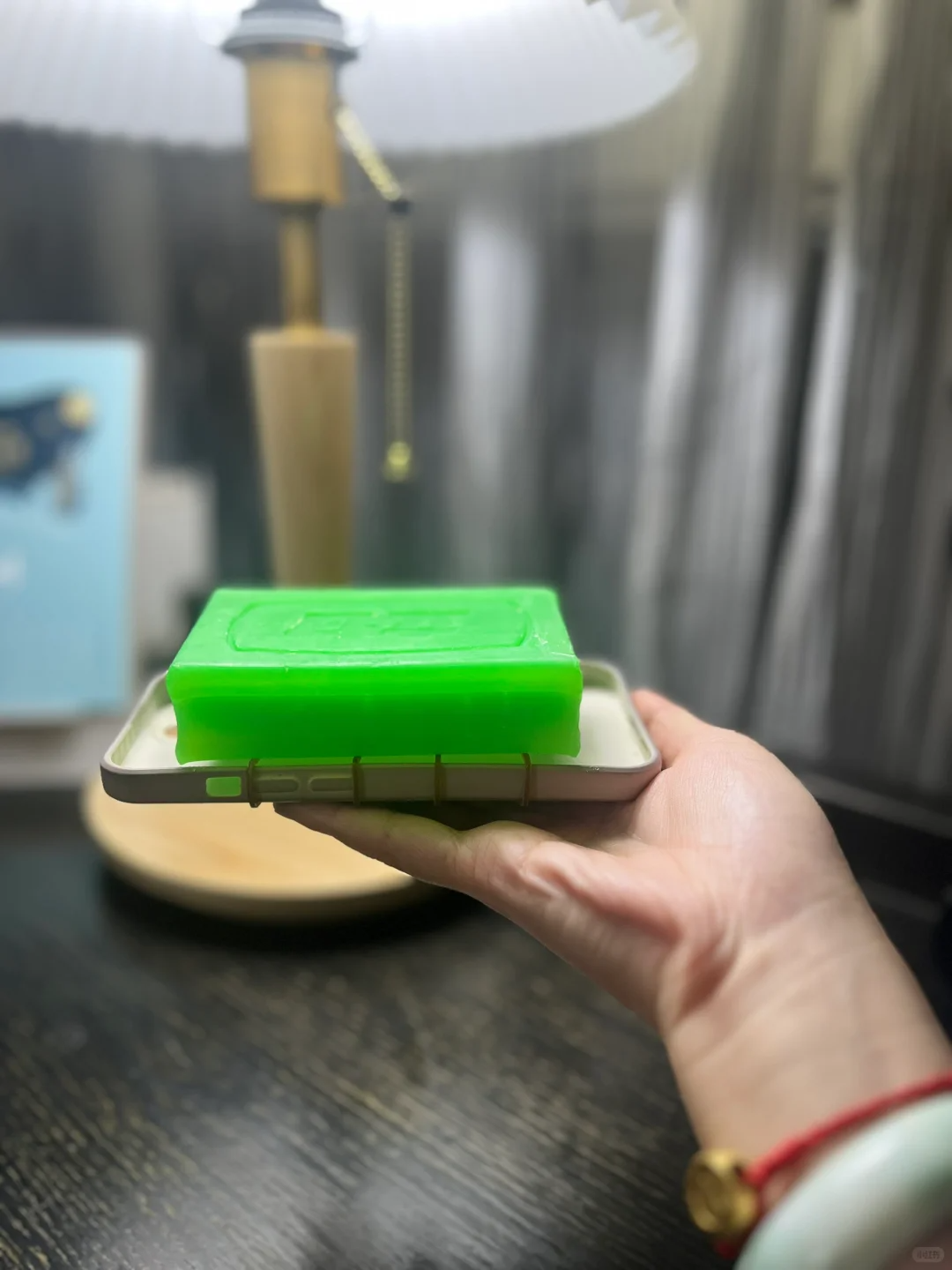 使用方法也特别简单,只要把皮筋绑在手机壳两侧,正好可以架住香皂。香皂也可以悬浮在手机壳上,还方便沥水。