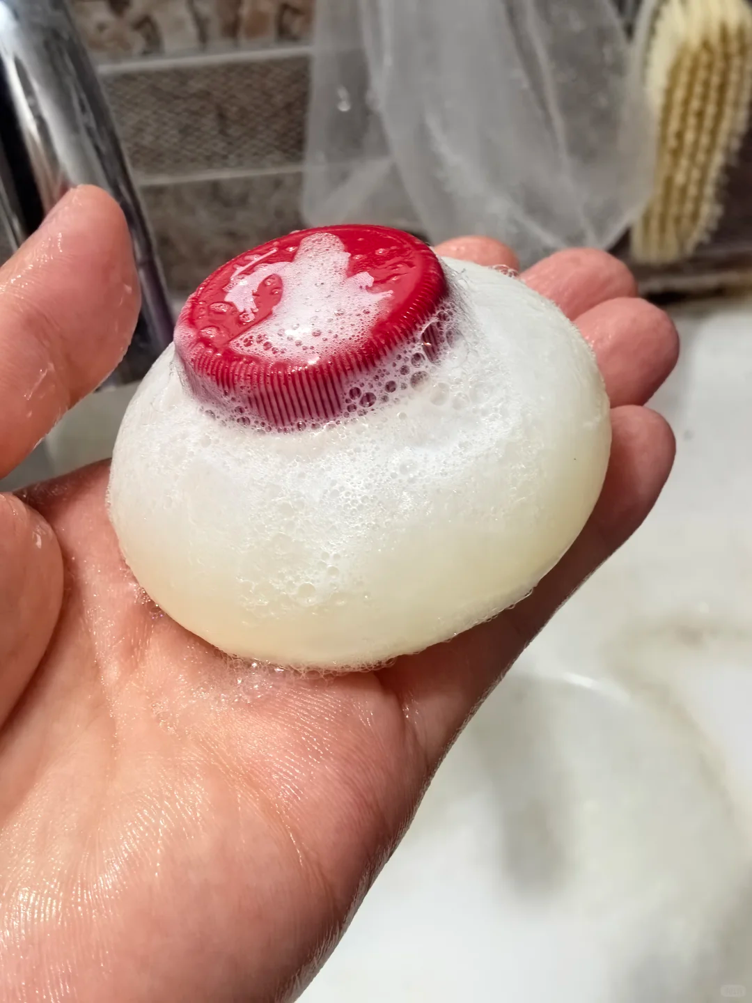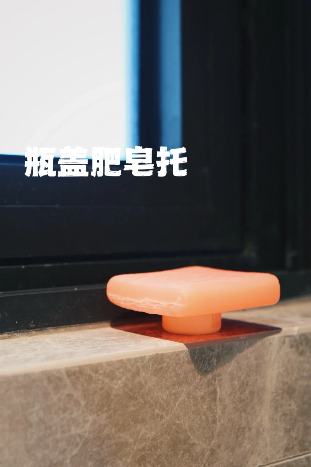 今天就教大家一个零成本的收纳方法,以上问题能够轻松解决。只要拿出一个瓶盖,然后使劲的摁在香皂中间的位置。