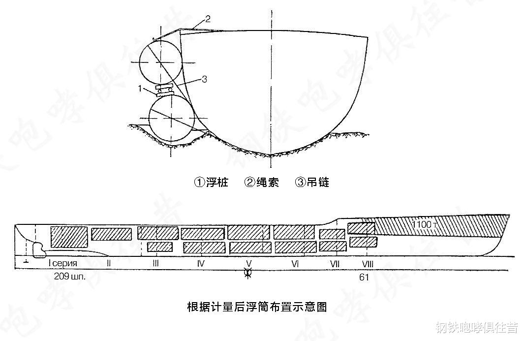 1943年10月,新罗西斯克登陆行动后港口被夺回,【塔什干】的打捞工作再次开始。计划是对0至61肋位间受损较小的舱室进行排水,左舷安装浮筒纠正横摇,通过计算在舰舯和后部安装80吨级浮筒提供2400吨浮力,后根据水下观察淤泥情况需再增加10%的浮力,共计2640吨。