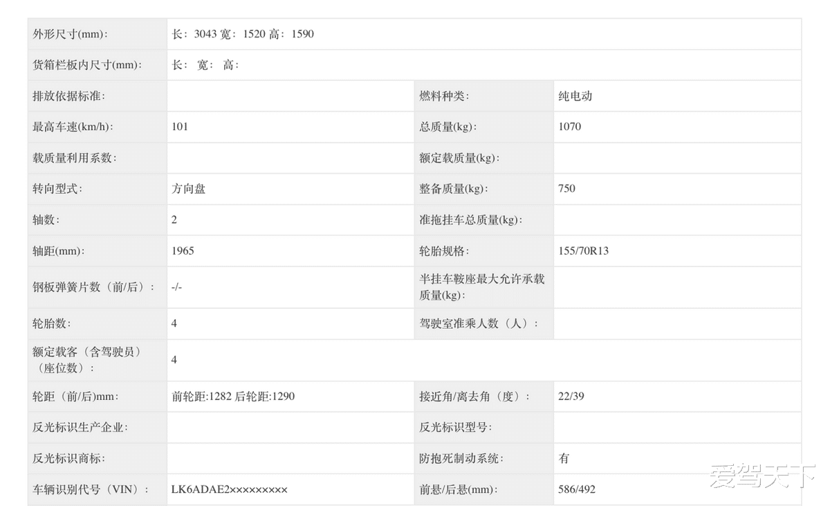 车身尺寸,新款宏光MINIEV提供两门版和四门版两种车型。其中,两门版长宽高分别为3043/1520/1590mm,轴距为1965mm,除了车宽,其余数据均比现款车型小了一号;四门版长宽高分别为3268/1520/1575mm,轴距为2190mm,相比于现款车型,新款的车长、宽度分别增加了12mm和10mm,高度缩减了3mm,轴距不变。