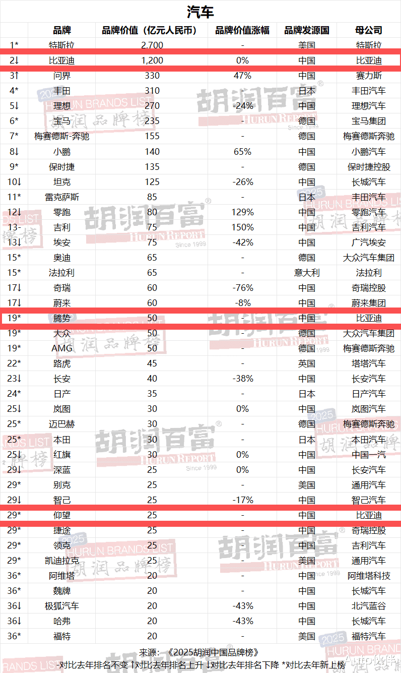 作为中国最早涉足电动汽车领域的企业之一,比亚迪领跑中国品牌价值,旗下腾势以50亿元、仰望以25亿元的品牌价值首次上榜,进入全球汽车行业品牌序列。