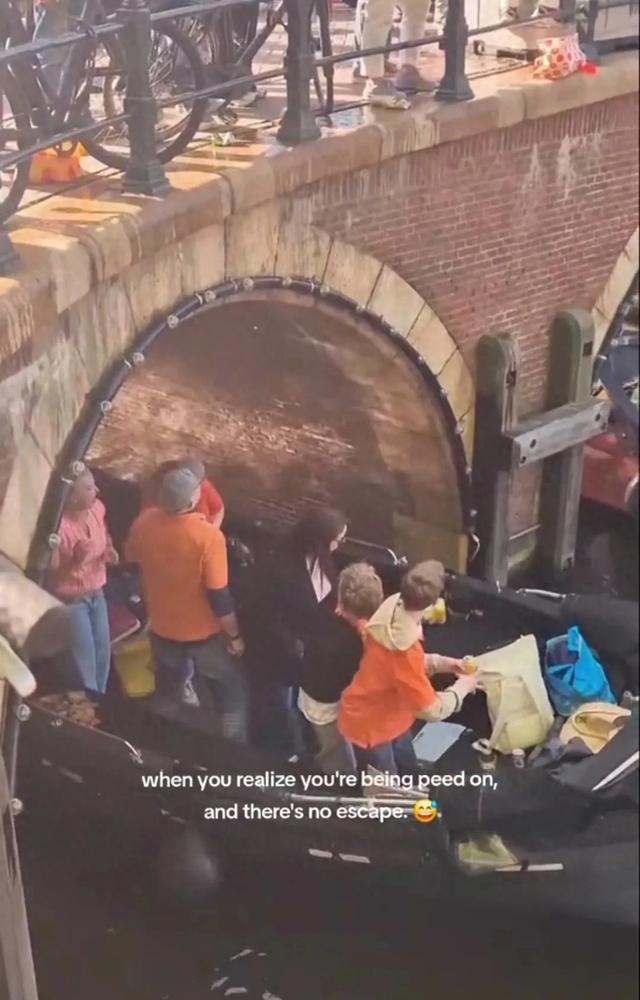 不知道是不是桥上有东西滴了下来。坐在船中间的女游客,立马站了起来,紧接着一个戴着牛仔帽的男人也跑到了船头。