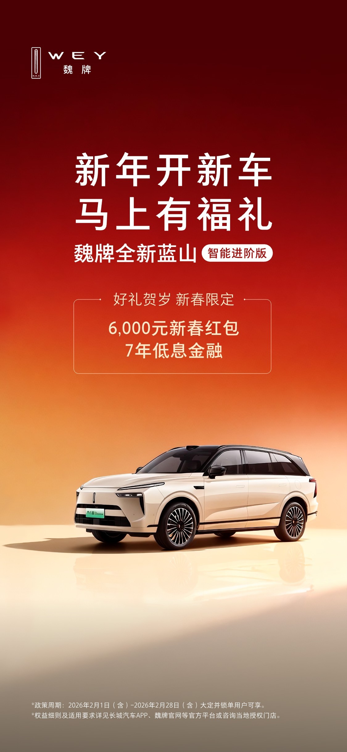 再加上现在临近春节,全新蓝山智能进阶版限时推出“新年开新车 马上有福礼”活动,即日起至2月28日,购车即享多重福利:6000元新春红包、5000元限时现金补贴双重好礼直接抵扣尾款,还有4000元保险补贴,累计立省1.4万元,诚意直接拉满。购车无忧礼二选一,灵活适配家庭需求:魏牌老用户享2万元增换购补贴,其他品牌用户也能领1.5万元补贴,轻松换新车迎新年;若想减轻资金压力,可选3年0息金融方案,让购车无负担,过年更舒心。