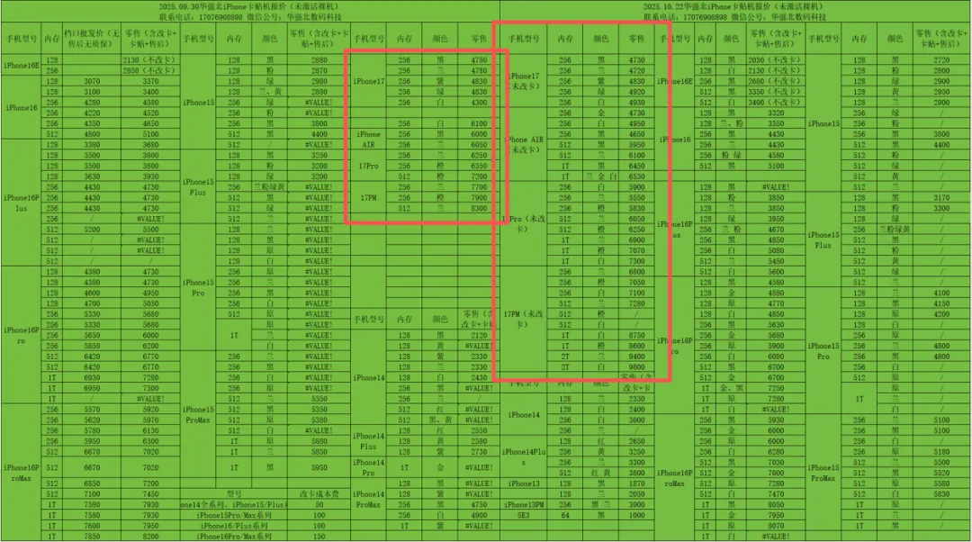 当然,也不是只有美版iPhone Air在狂跌,iPhone今年的新机,除了iPhone17基础款之外,其他的机器都有一个比较大的跌幅,这个就和华强北改卡方案有关系了,目前只有iPhone17基础款可以完美改卡。
