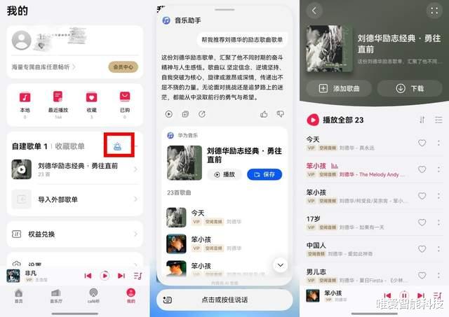 看完MV意犹未尽,我想再多听几首华仔的励志歌。正好升级HarmonyOS 6后,华为音乐新增了音乐助手功能。我直接在“我的”页面点开那个彩色按钮,对它说“帮我推荐刘德华的励志歌曲歌单”,没几秒就生成了一个专属歌单,《今天》《笨小孩》《17岁》这些经典全都在里面。这种随听随问的体验挺方便,就像有个懂音乐的朋友在旁边帮我选歌。