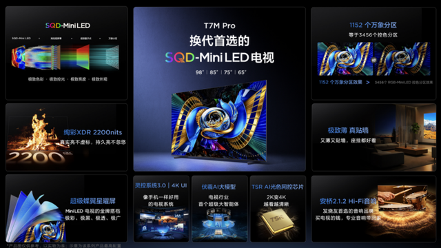 音质方面,TCL T7M Pro搭载安桥2.1.2 声道Hi-Fi音响,天空声道与超重低音带来超强环绕感。TSR AI光色同控芯片、4K 150Hz高刷、灵控系统3.0与伏羲AI大模型的18+N智能体,共同构成了满级配置。无论是色彩技术、屏幕素质、分区控光、刷新率还是画质芯片,TCL T7M Pro都实现了全面进化,成为电视换代的不二之选。价格方面,65/75/85/98英寸国补后入门价位直达5千元档,将SQD-Mini LED技术带入前所未有的亲民区间。
