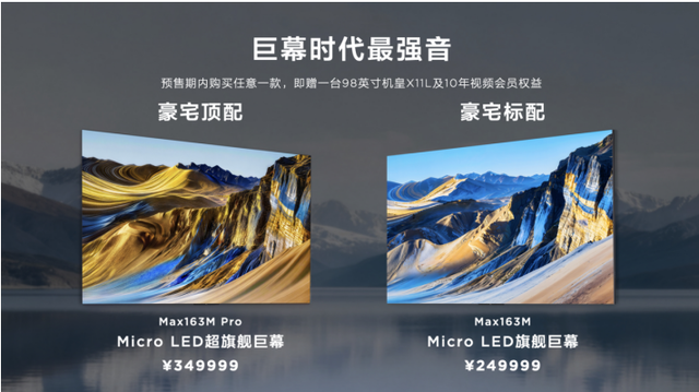 在普及SQD-Mini LED的同时,TCL还带来巨幕时代的最强音——163吋Micro LED旗舰巨幕双曜登场。豪宅顶配的Max163M Pro与豪宅标配的Max163M,均搭载2488万多颗无机自发光芯片,实现真4K实像素,其中Max163M Pro峰值亮度直达XDR 10000+nits。从2024年百万元级到如今Max163M定价249999元,TCL正将Micro LED从遥不可及的收藏品变为豪宅首选,让超沉浸式的巅峰画质体验进入更多家庭。