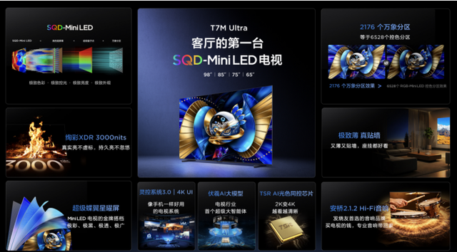 本次发布会还带来客厅的第一台SQD-Mini LED电视TCL T7M Ultra。作为六大维度技术进阶的全能选手,T7M Ultra搭载2176个万象分区(分区数与6528个分区的RGB电视相等)与绚彩XDR 3000nits峰值亮度,承袭100%BT.2020全局高色域的技术基因,配合安桥2.1.2声道Hi-Fi音响,同样成为全能无短板的影游搭子。