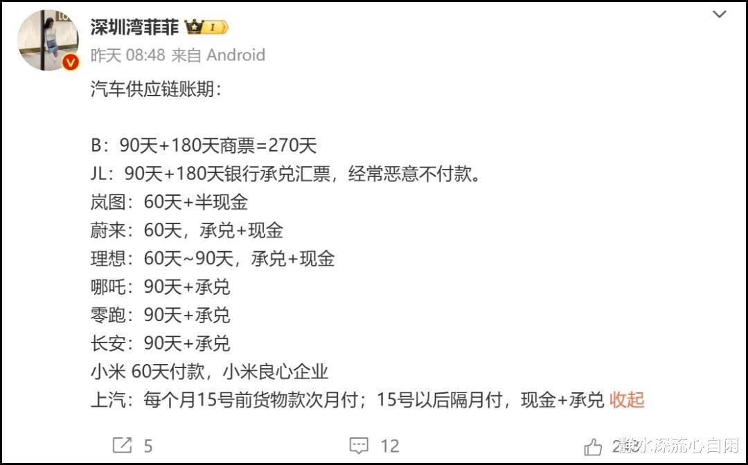 实际上,在车企给供应商回款的过程中,还有别的操作方式。比如根据某财经博主表示,大部分车企的账期都由天数+承兑/商票构成,而承兑/商票可以理解为车企开给供应商的“欠条”,或者是可以流通的区块链担保,这些商业担保同样有周期,所以并不是到期后供应商就能直接收到现金。
