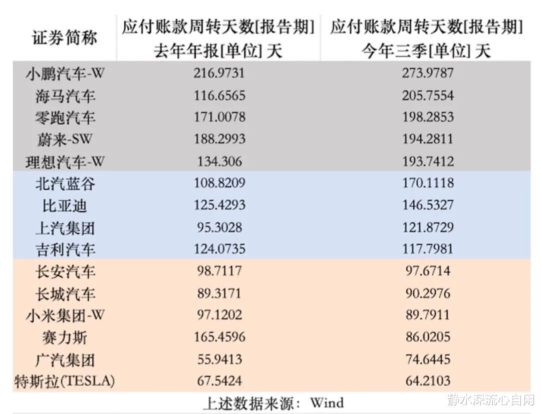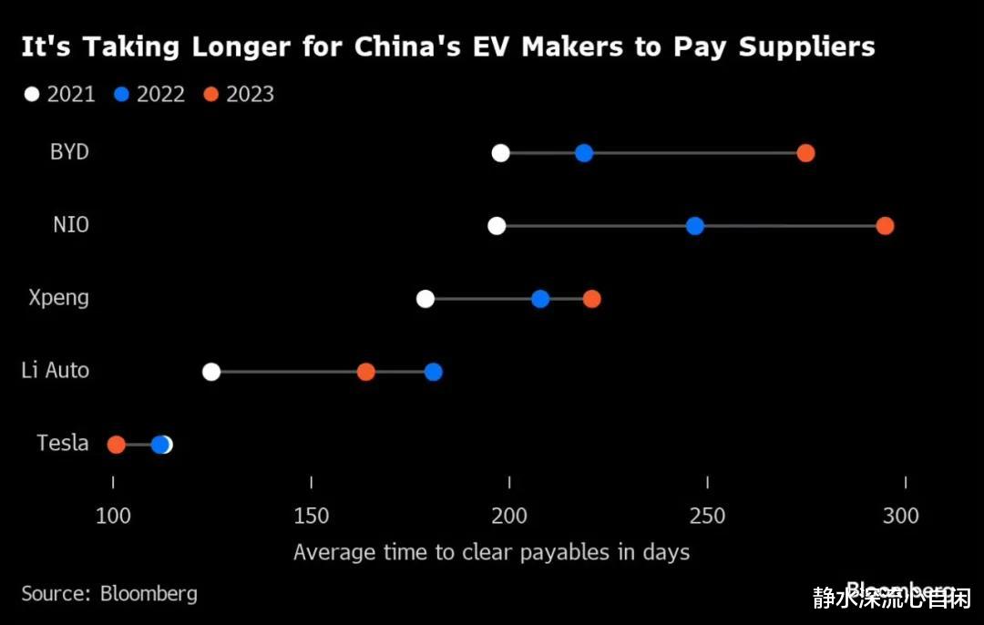 随后我们找到了表格的原出处,从图表上看,2023年特斯拉的平均账款结清天数为100天左右,相比2021、2022年进一步缩短。而表格中的另外几家新能源车企,则普遍在150天、甚至250天以上。