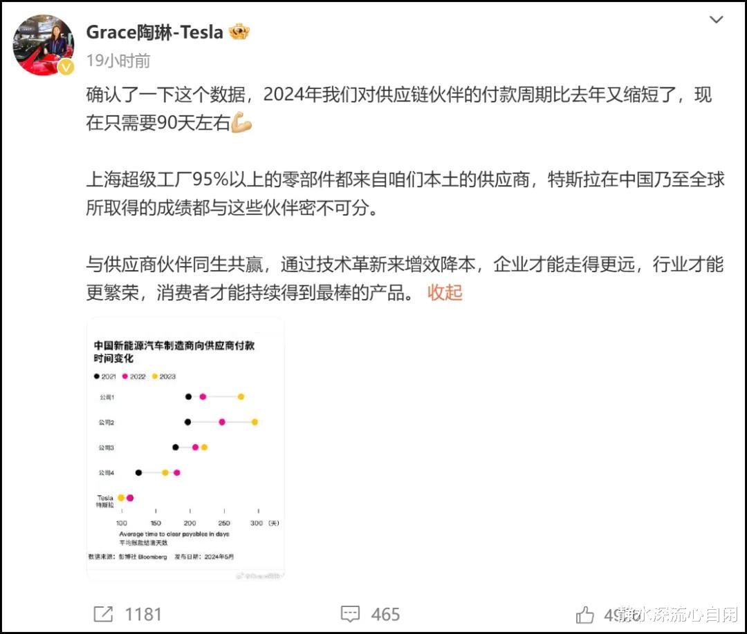 不知道是不是受到比亚迪供应商邮件风波的影响,最近车企与供应商之间的微妙关系开始被大家关注了起来。特斯拉的高管陶琳就在个人社交账号上发布内容表示,2024年特斯拉对供应链伙伴的付款周期相比2023年进一步缩短,现在只要90天左右,并晒出了一张由彭博社统计的图表。