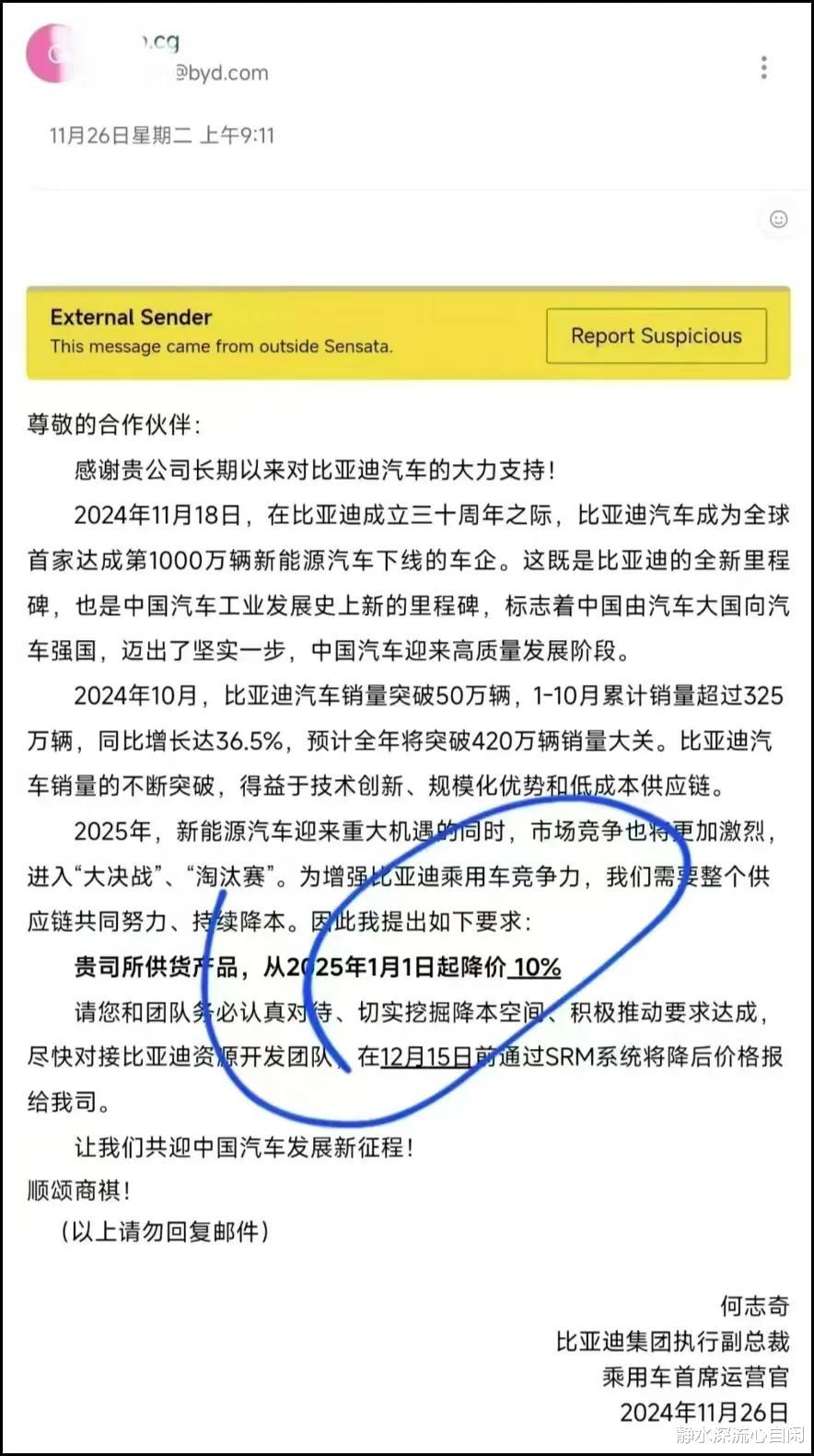 本周一张疑似某供应商内部邮件截图曝光,邮件显示,该供应商被比亚迪要求,从2025年1月1日起降价10%,以应对市场竞争。邮件曝光后,这件事迅速引发了争议,网友也都给出了不同的观点。