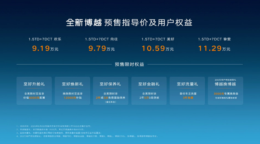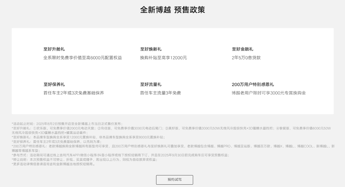 全新博越预售期即释放多重专属权益:全系限时赠送价值6000元的配置升级(升舱礼);换购用户最高可享12000元补贴(焕新礼);部分车型提供2年5万元额度0利息金融方案(金融礼)。首任车主还可获赠3年免费车机流量(流量礼)及2年或3次免费基础保养(保养礼)。特别为200万博越老用户准备了3000元专属购车金(用户感恩礼),覆盖购车、用车、换车全链条。
