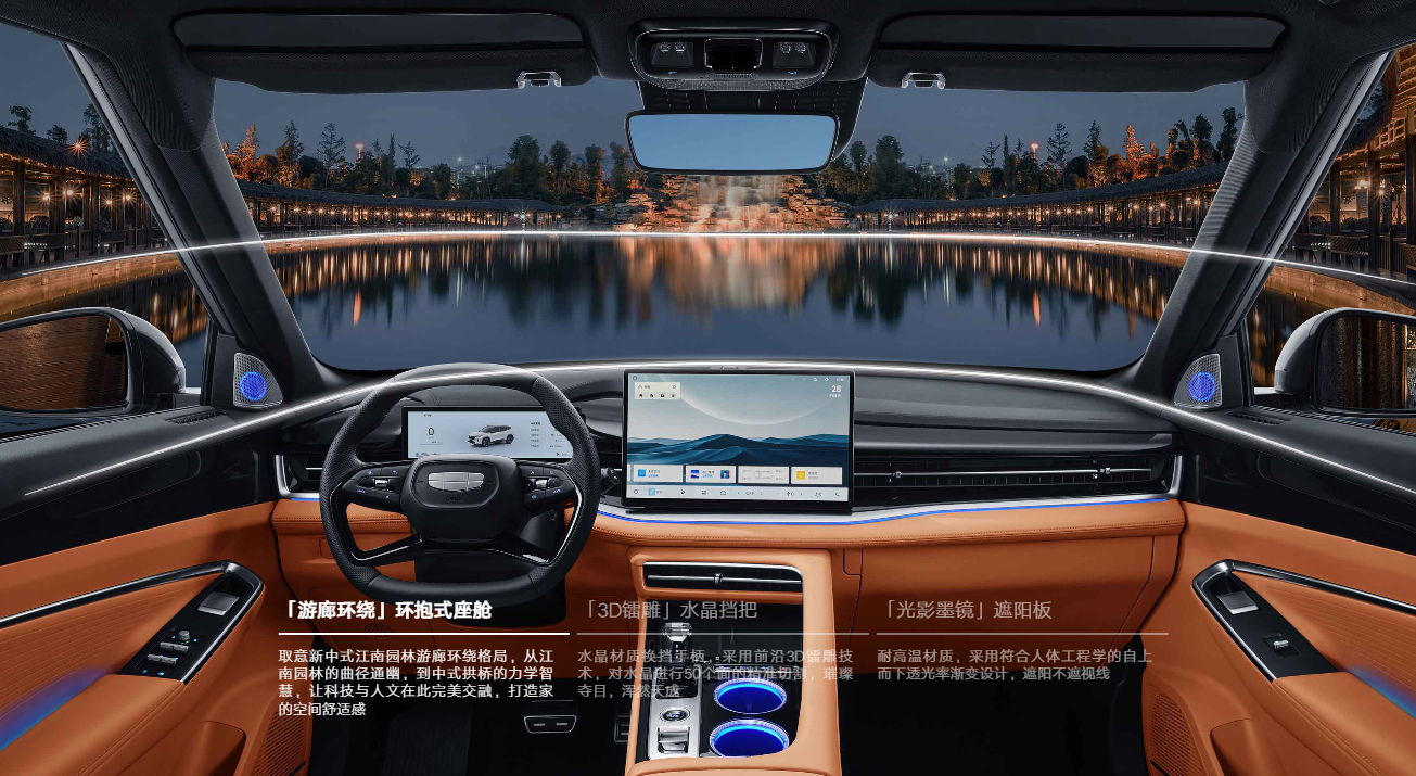 新车采用吉利家族最新设计语言,融合中式建筑的稳重与现代工艺的精巧。前脸标志性的12道竖状格栅(官方称灵感源于“长桥卧波”),传递扎实与团圆意象。长达2.05米的前贯穿式灯带,不仅点亮辨识度,更提供超越同级的照射距离,提升夜间行车安心感。