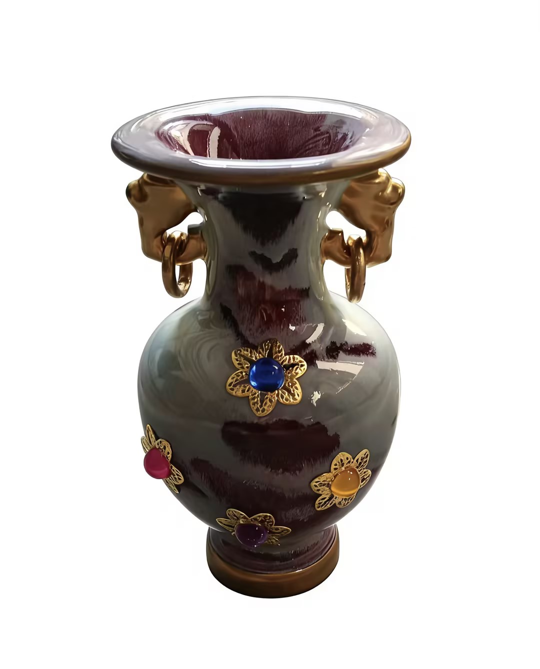 二、脊骨价值:跨界手艺的 “技艺价值”—— 老工艺的 “当代活化”这只瓶的 “镶金嵌宝 + 双耳衔环”,不是 “装饰的附加”,而是 “传统工艺跨界融合” 的 “技艺稀缺性”—— 它把 “三种老手艺” 从 “各自的赛道” 拉到 “钧瓷的载体” 上,是 “手艺活化” 的价值。