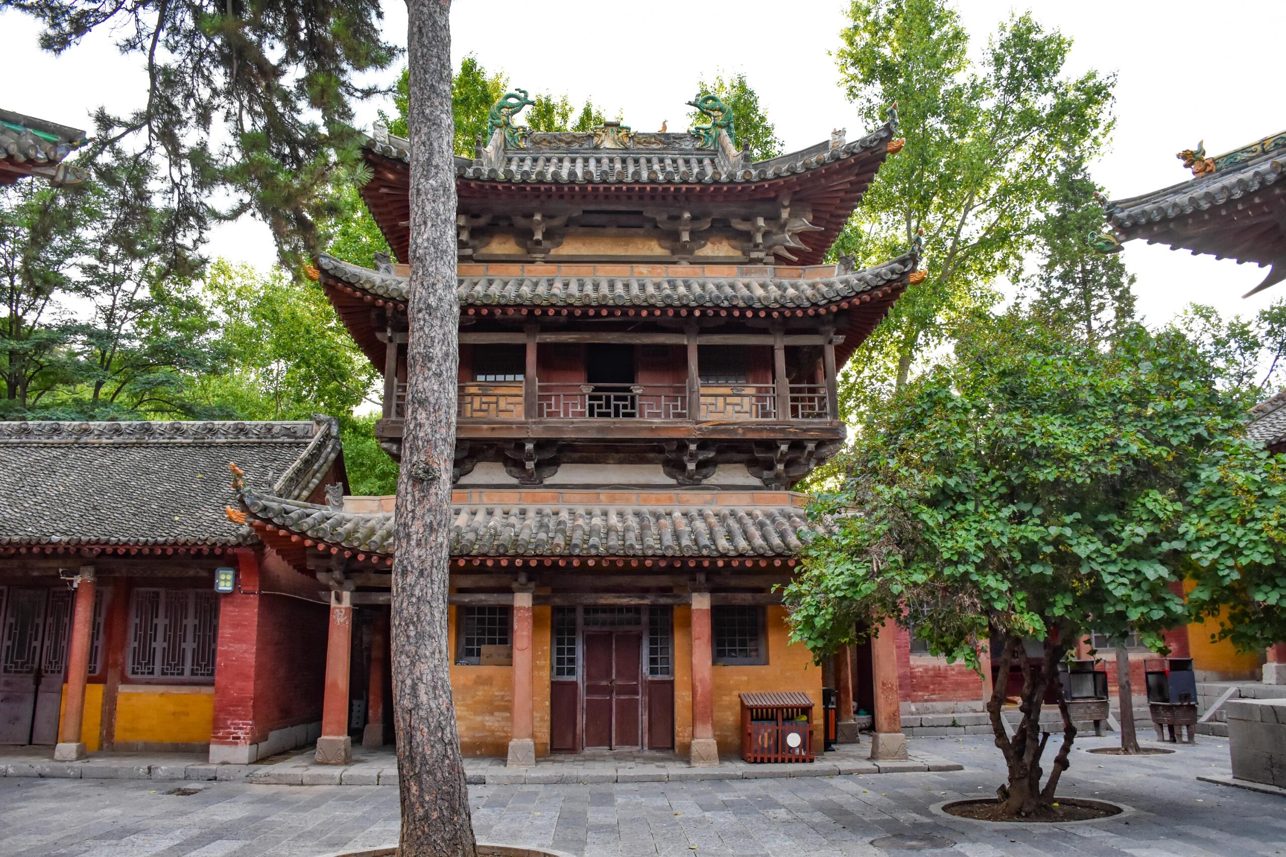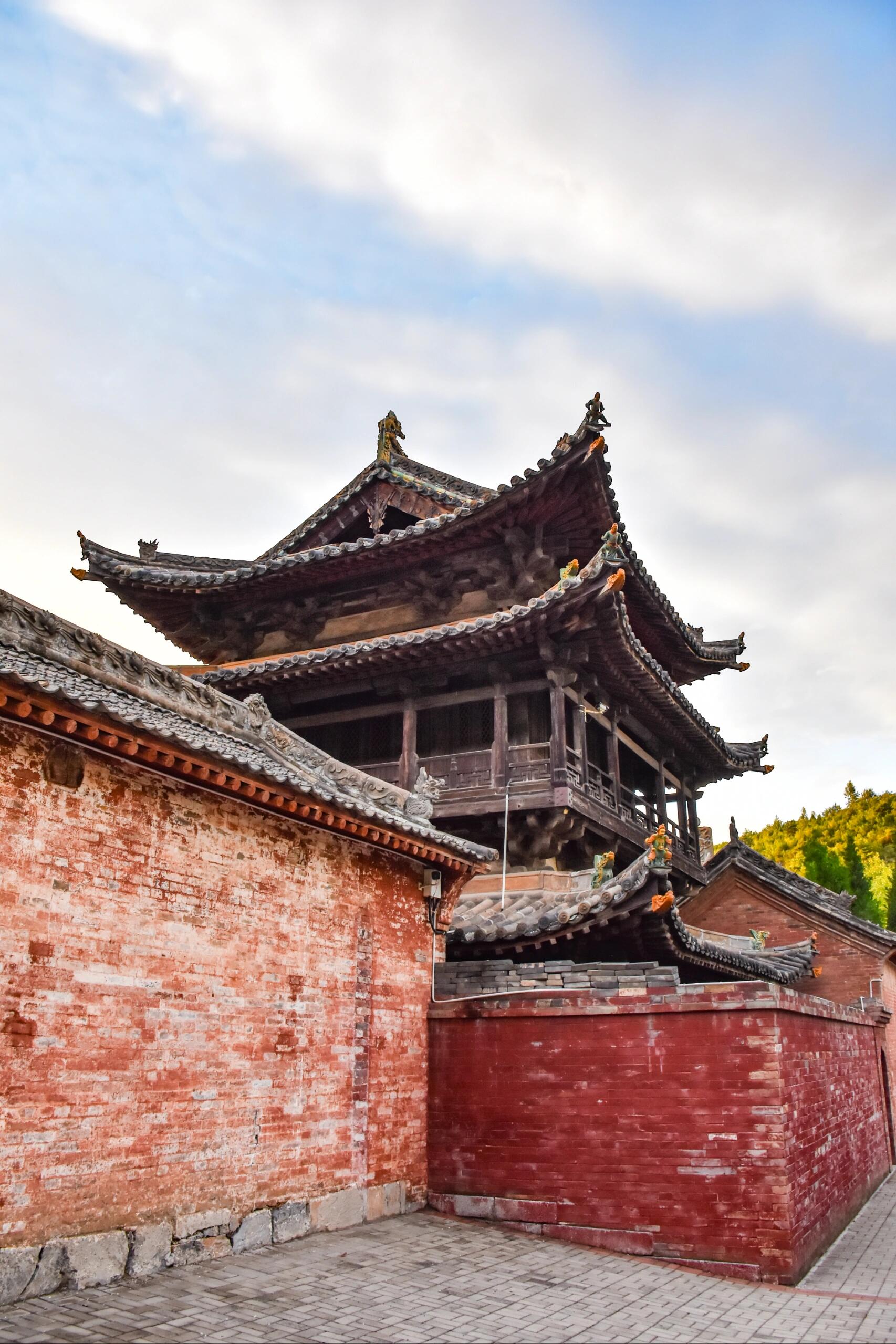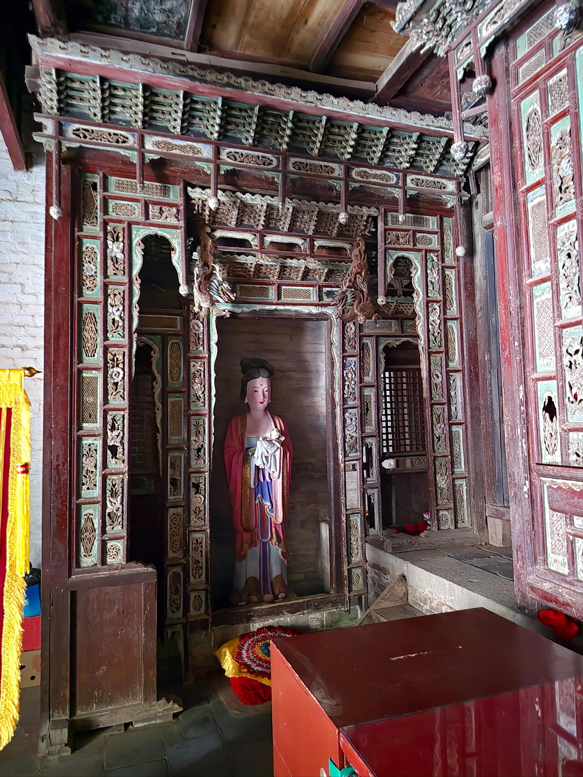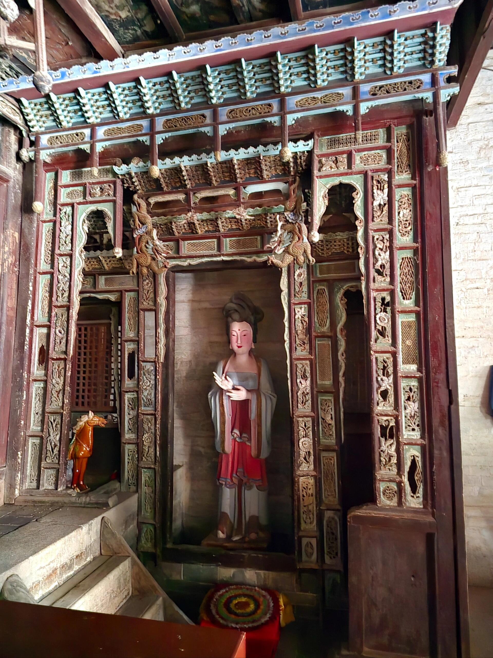 最让人挪不开脚的是东西两座梳妆楼。金代的木头早成了深褐色,可那歇山顶的弧度还跟新的一样,飞檐翘得比戏台的龙吻还张扬。东边楼的窗棂是万字纹,西边的却是回字纹,老李说东边是姐姐冲惠的,西边是妹妹冲淑的,“姐妹俩生前就爱打扮,成仙了也得有自己的花样。”楼梯窄得只能容一个人过,踩上去“咯吱”响,像楼在跟人撒娇。二楼的铜镜早没了,可墙面上还有圆圆的印痕,阳光从窗棂钻进来,正好落在印痕上,晃得人睁不开眼,倒像是镜子还在照着谁的脸。