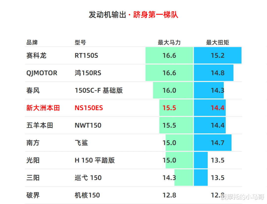 PART.02动力与推重比:中规中矩动力方面,NS150ES搭载的是国产化的SH-EP 150cc单缸水冷四气门发动机,压缩比 12:1,最大功率 11.4kW/8500rpm,最大马力 15.5Ps,峰值扭矩 14.4N・m/6500rpm。单看参数,这套动力在150cc级别里只能算中游水平,和同价位国产车型比,账面数据全面落后,甚至比不过几年前的老款国产150机型。