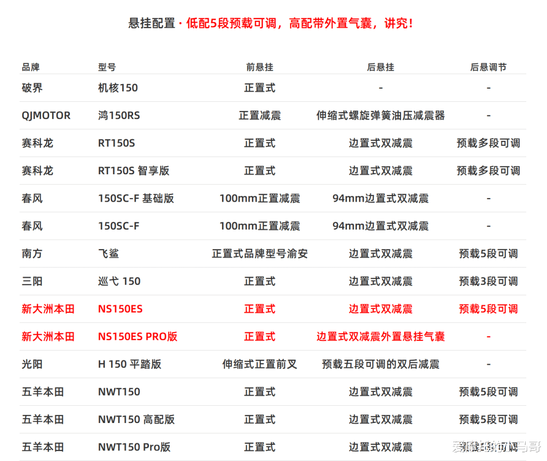 PART.05硬件配置:入门版诚意拉满不少品牌喜欢玩“低价引流”套路,把入门版的配置减得惨不忍睹,但洲洲这次反其道而行之,核心配置全系无差别,入门版就给到了足够的诚意,反而高配版的升级显得毫无性价比。悬挂配置这里必须给好评,NS150ES的入门版虽然没有高配的外置气囊后减震,但依旧保留了 5 段预载可调功能,这波确实很讲究。哪怕是和同价位的国产车型比,这份配置诚意也不落下风。