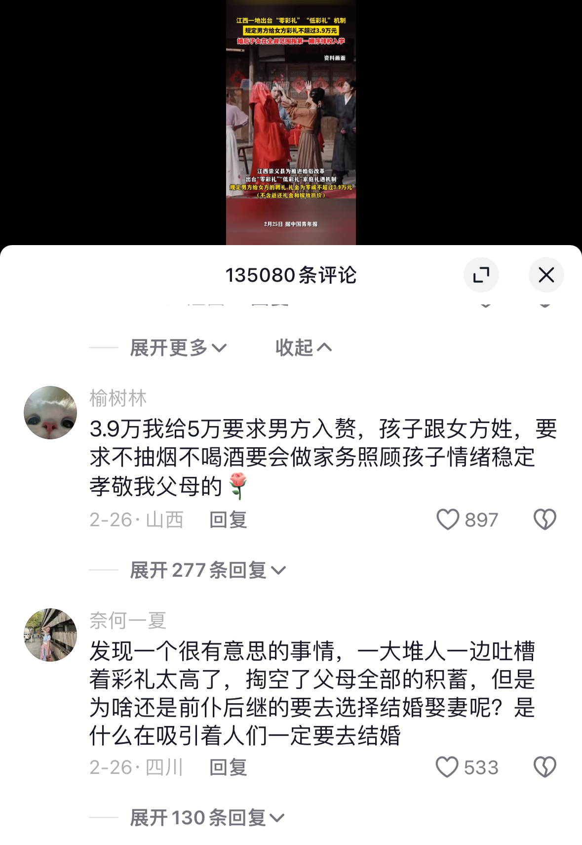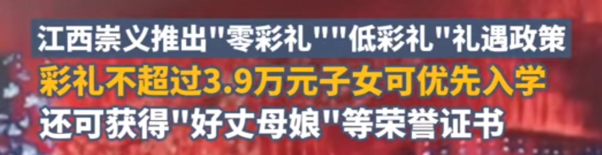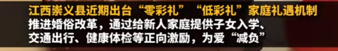 近日,江西一地为推进婚俗改革,出台“零彩礼”、“低彩礼”机制,规定男方给女方彩礼不能超过3.9万元,不含返还礼金和嫁妆。婚后子女在全县范围按第一顺序择校入学。