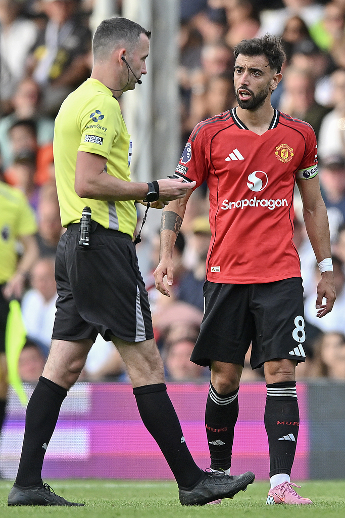 比赛第38分钟,曼联队获得点球。然而,就在B费准备主罚点球的关键时刻,意外发生了。主裁判卡瓦纳从B费身边走过,两人发生了碰撞。这一突如其来的碰撞,让B费瞬间情绪失控,他愤怒地向裁判表达不满,甚至将已经放置在点球点的球抱起,重新进行罚球准备流程。但最终,B费的点球还是高高地飞出了横梁,曼联错失良机。