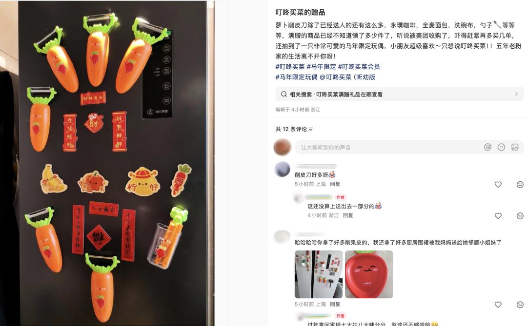 打工人细数叮咚买菜的桩桩件件,甚至连会员免费送赠的周边都不放过。“胡萝卜刮皮刀巨好用”“围裙真的很实用”等等用户反馈随处可见。