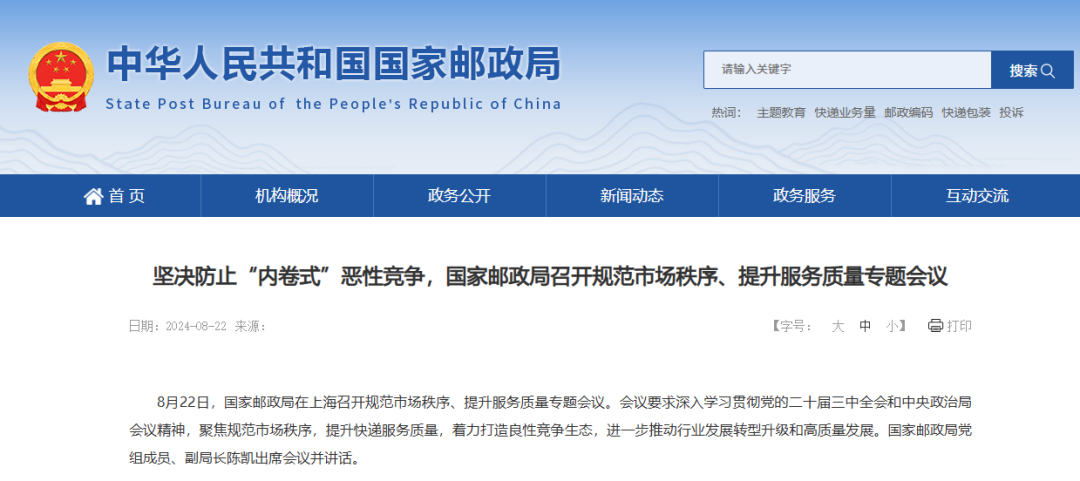 早在2024年8月,国家邮政局召开专题会议,要求提升快递服务质量,打造良性竞争生态,坚决防止“内卷式”恶性竞争,如单纯价格和业务量的竞争等。