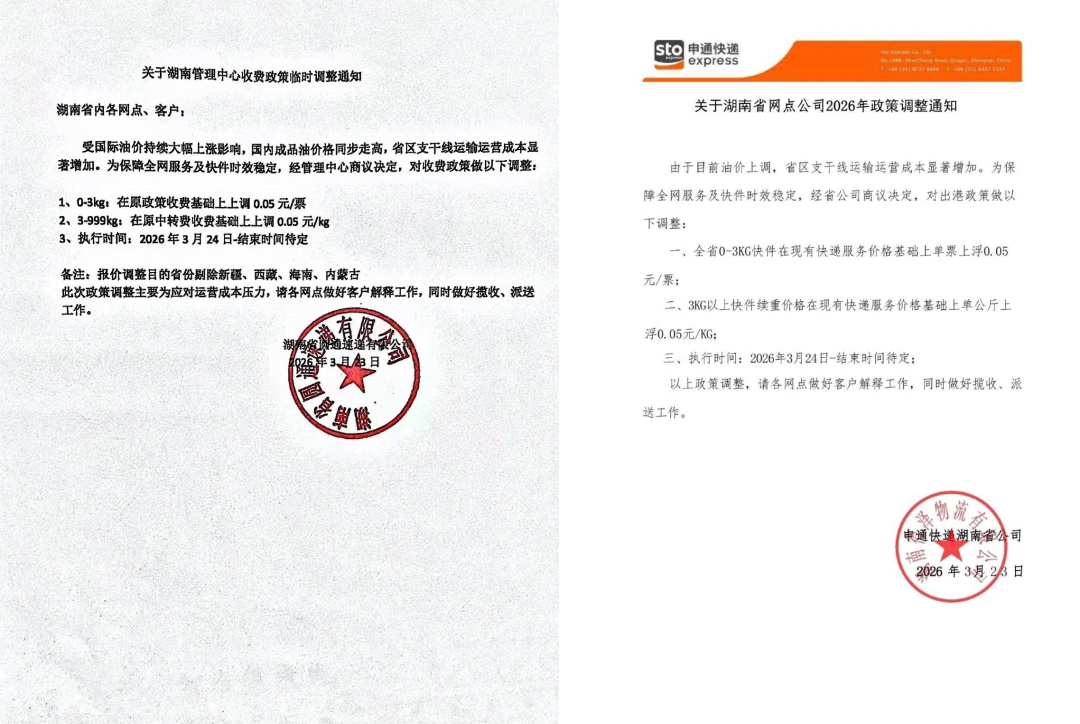 3月24日,湖南快速跟进:圆通、申通等几大加盟快递发布关于政策调整通知,全省0-3KG快件在现有快递服务价格基础上单票上浮0.05元/票、3KG以上快件续重价格在现有快递服务价格基础上单公斤上浮0.05元/KG。