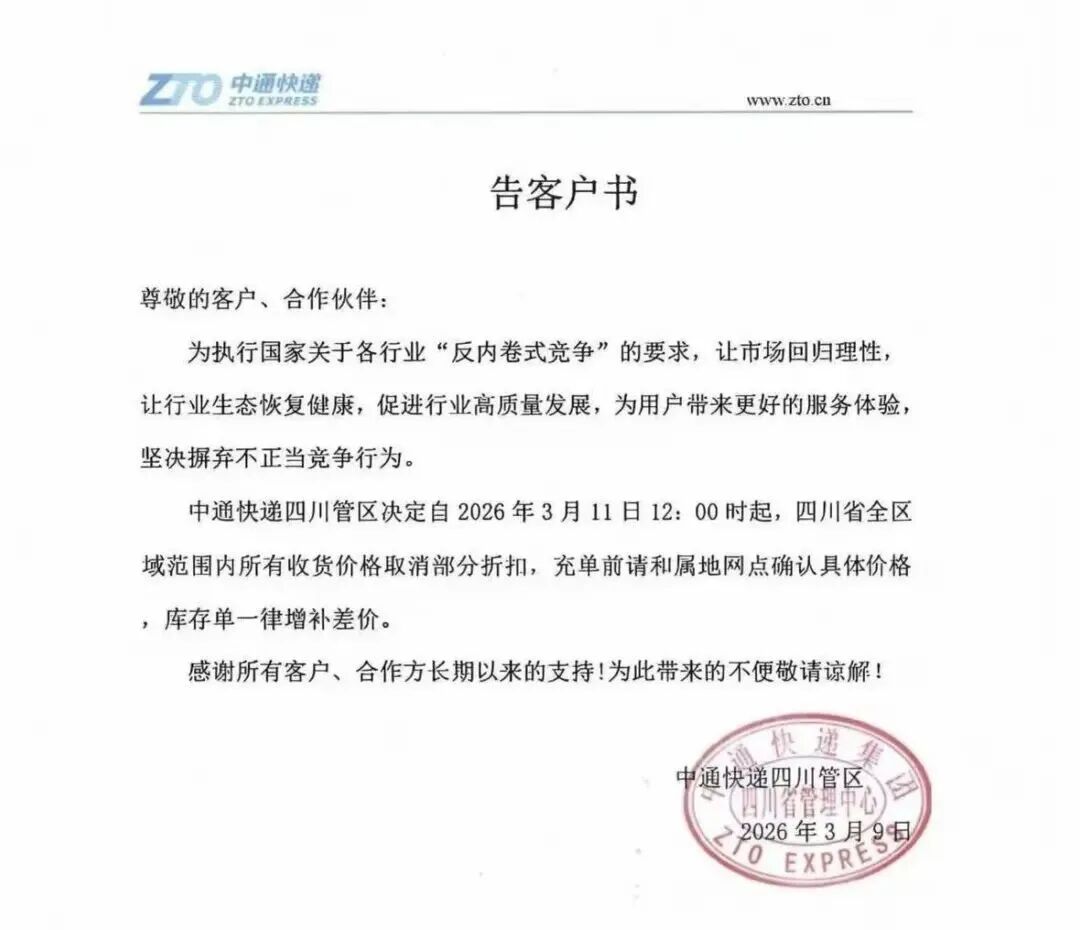 此后四川率先启动涨价,3月10日,极兔、中通、圆通、申通等企业宣布,3月11日起全省取消部分折扣,末端派费和收件价格同步上调0.1-0.3元/票。