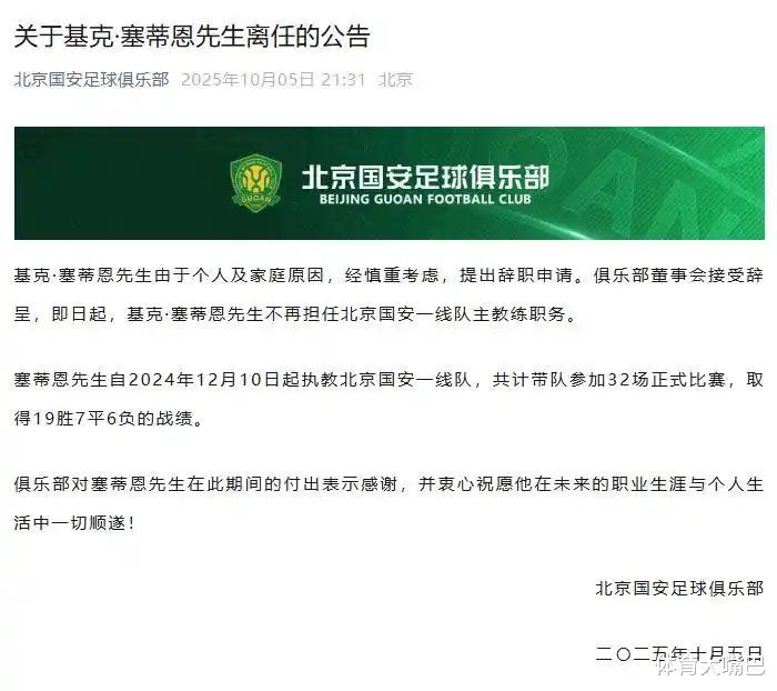 中国的国庆假日尚未结束,西班牙名帅塞蒂恩已经无法和国安将士们一起共赏月。在以0-3输掉和澳超球队的亚冠二级联赛之后,塞蒂恩的下课就已经成为定局了。可以毫不客气地说,北京国安队在下半赛季的崩盘是必然的,塞蒂恩的下课有“背锅”的成分,北京国安队要想复兴,也绝不仅仅是换掉一个塞蒂恩就可以解决问题的。