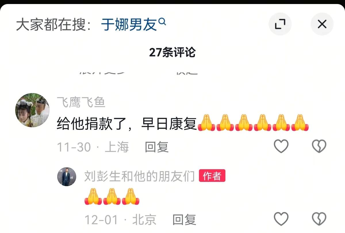 就在上月末,刘彭生还在该账号中发文,透露于娜的男友处于病危状态,并送上祝福。