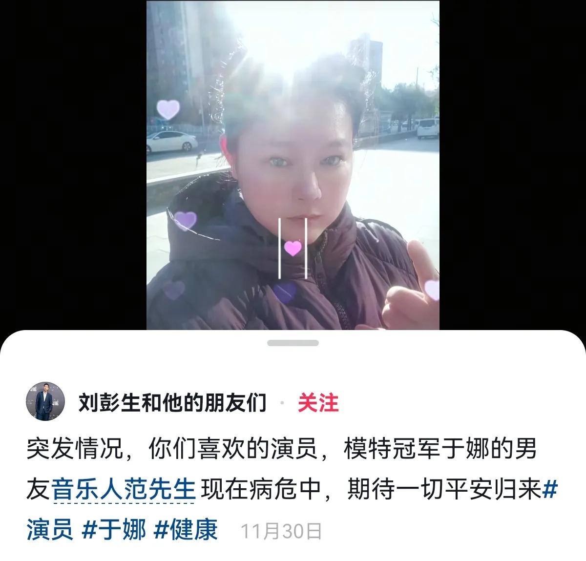 12月16日,于娜再度成为网友的关注焦点,男模刘彭生在最新分享的动态中表示,于娜男友范先生病逝。