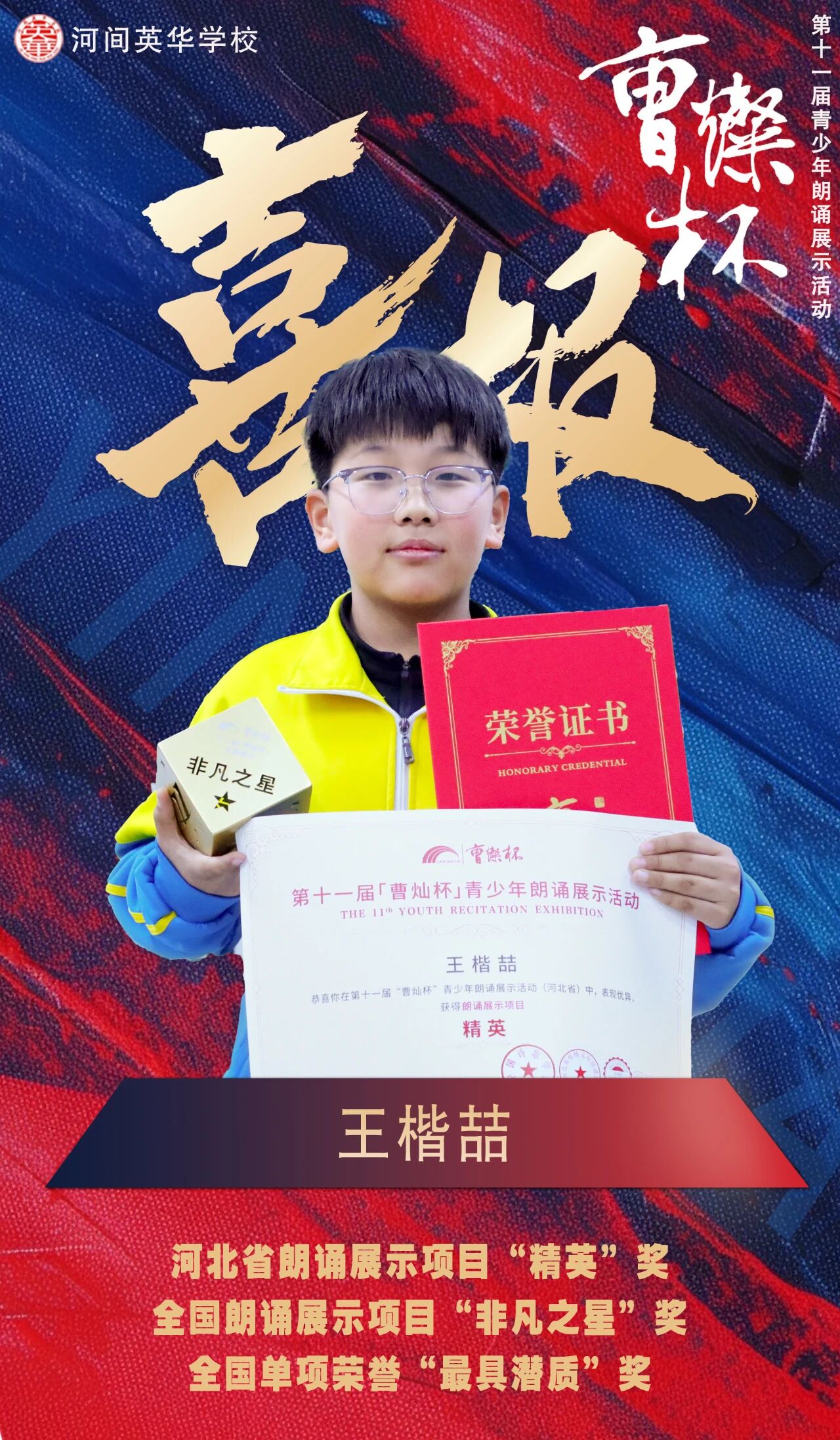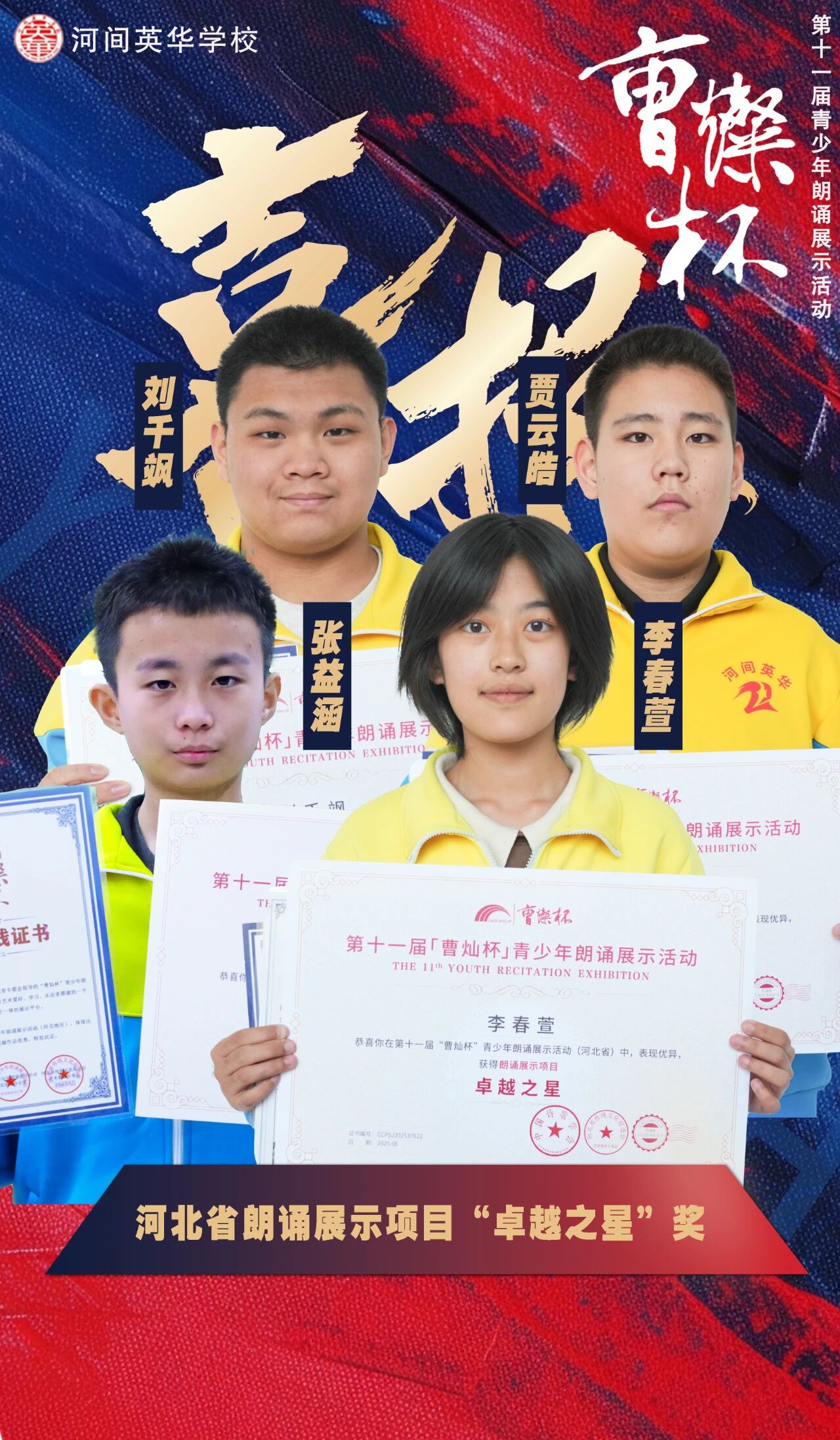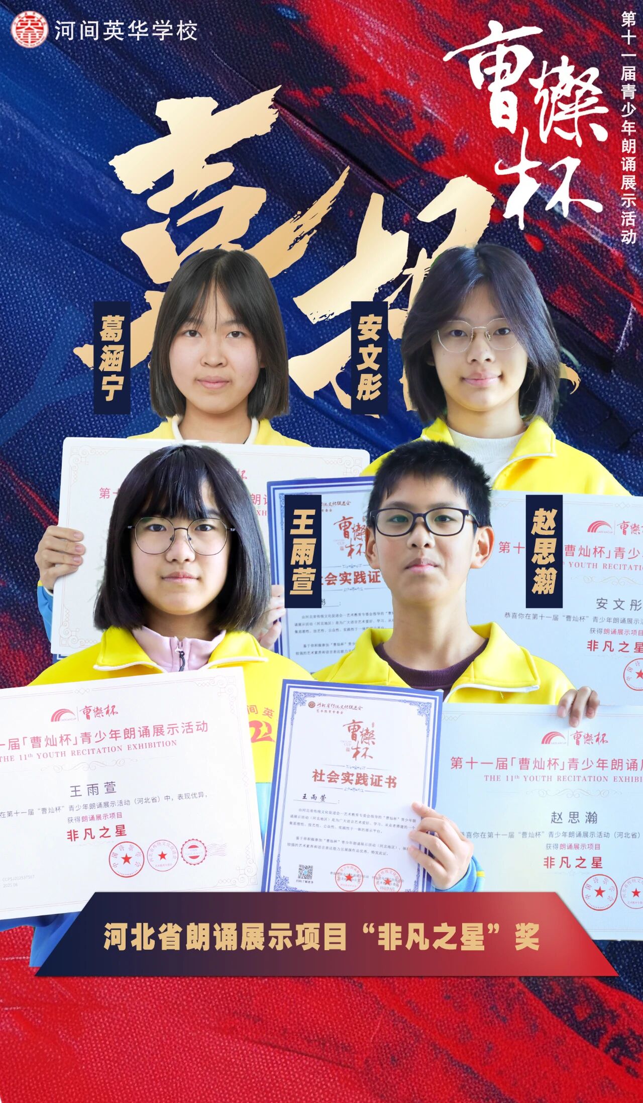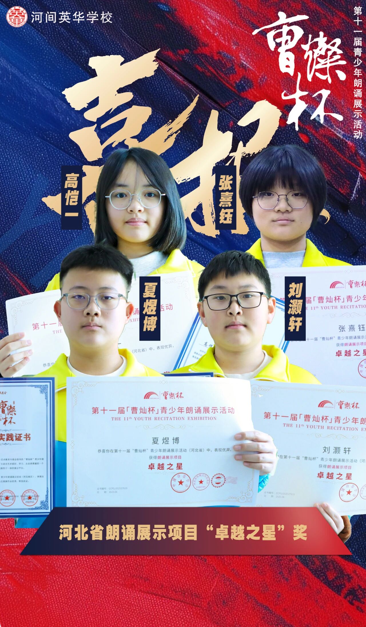 近日,被誉为“青少年语言艺术殿堂”的“曹灿杯”全国青少年朗诵展示活动,向河间英华学校传来振奋捷报!该校学子在全国数十万参