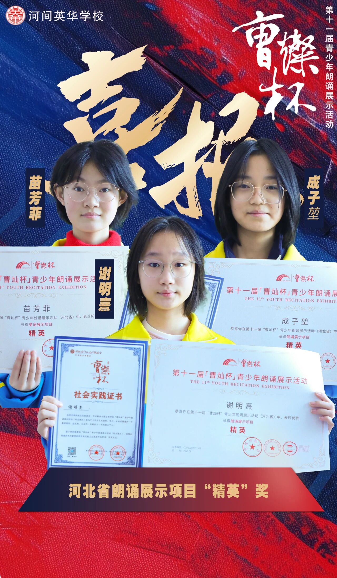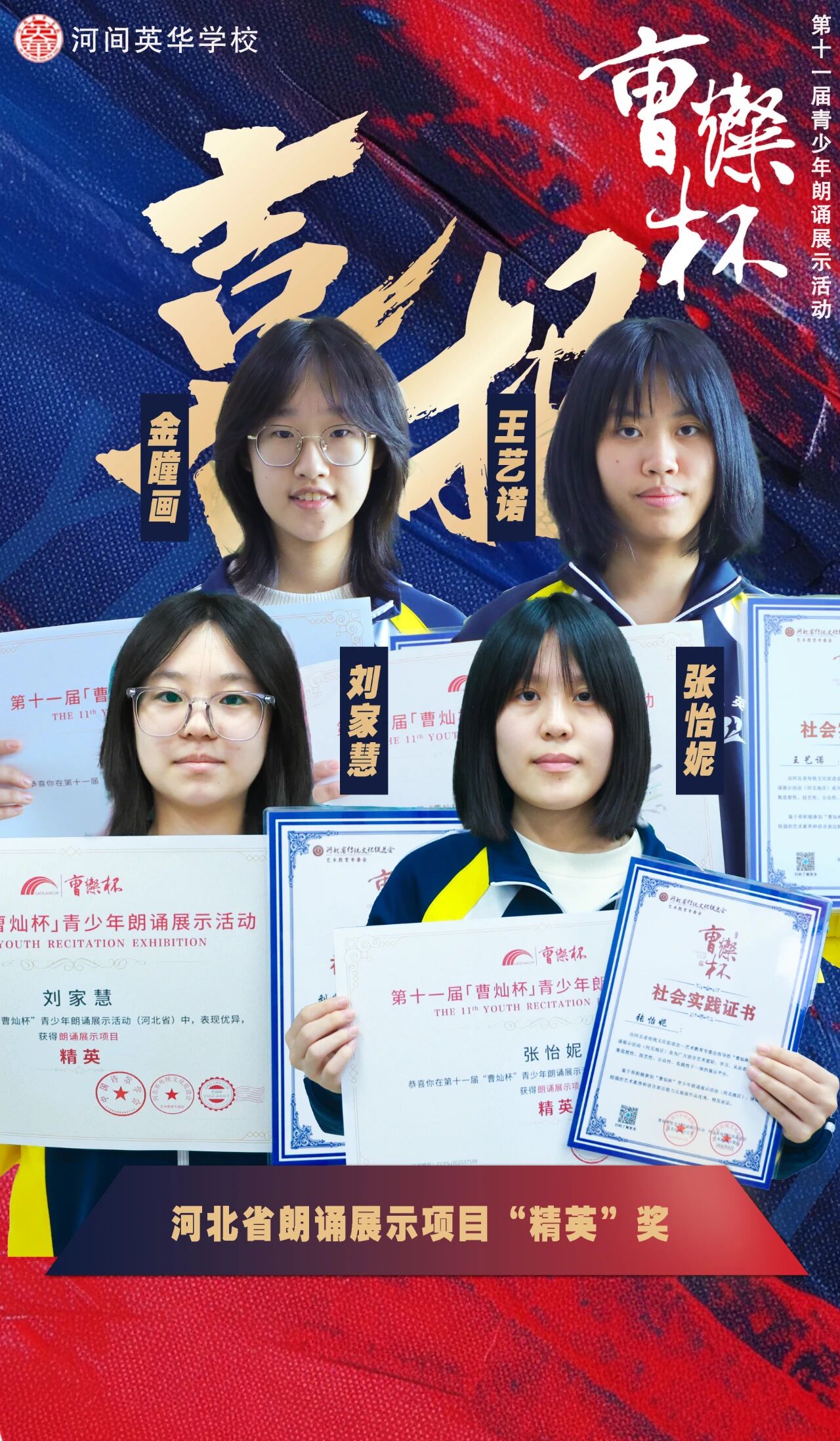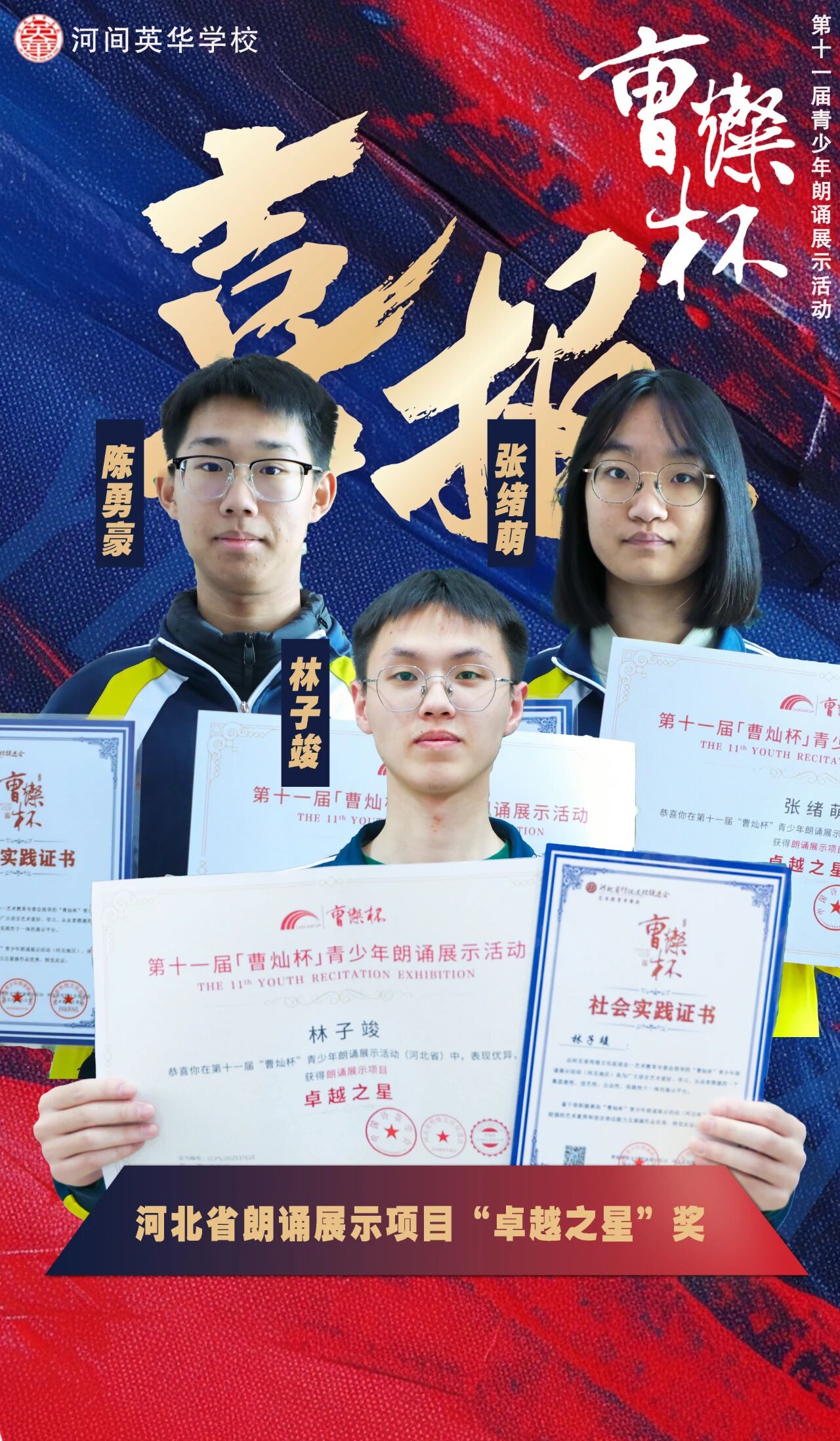 近日,被誉为“青少年语言艺术殿堂”的“曹灿杯”全国青少年朗诵展示活动,向河间英华学校传来振奋捷报!该校学子在全国数十万参