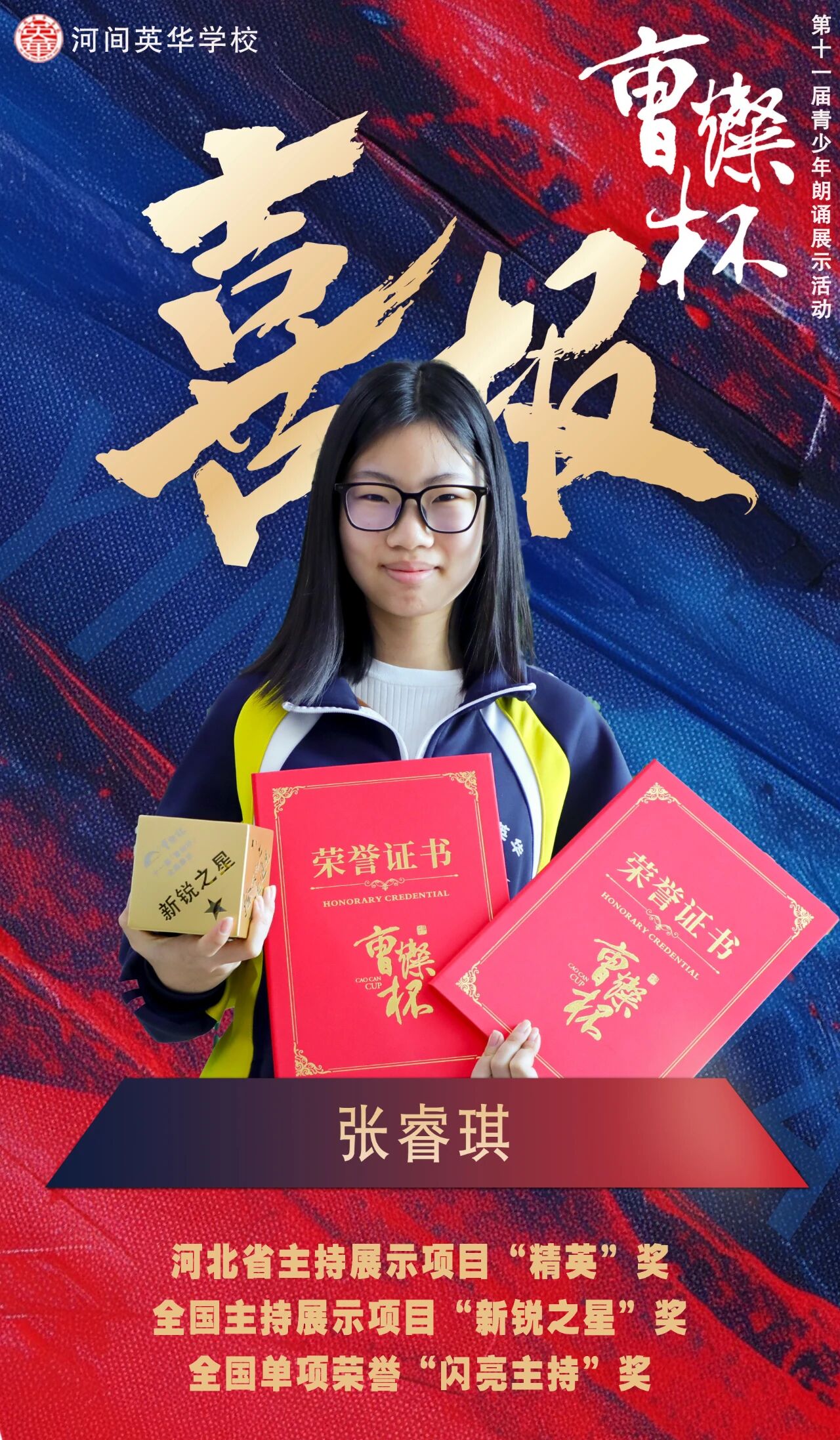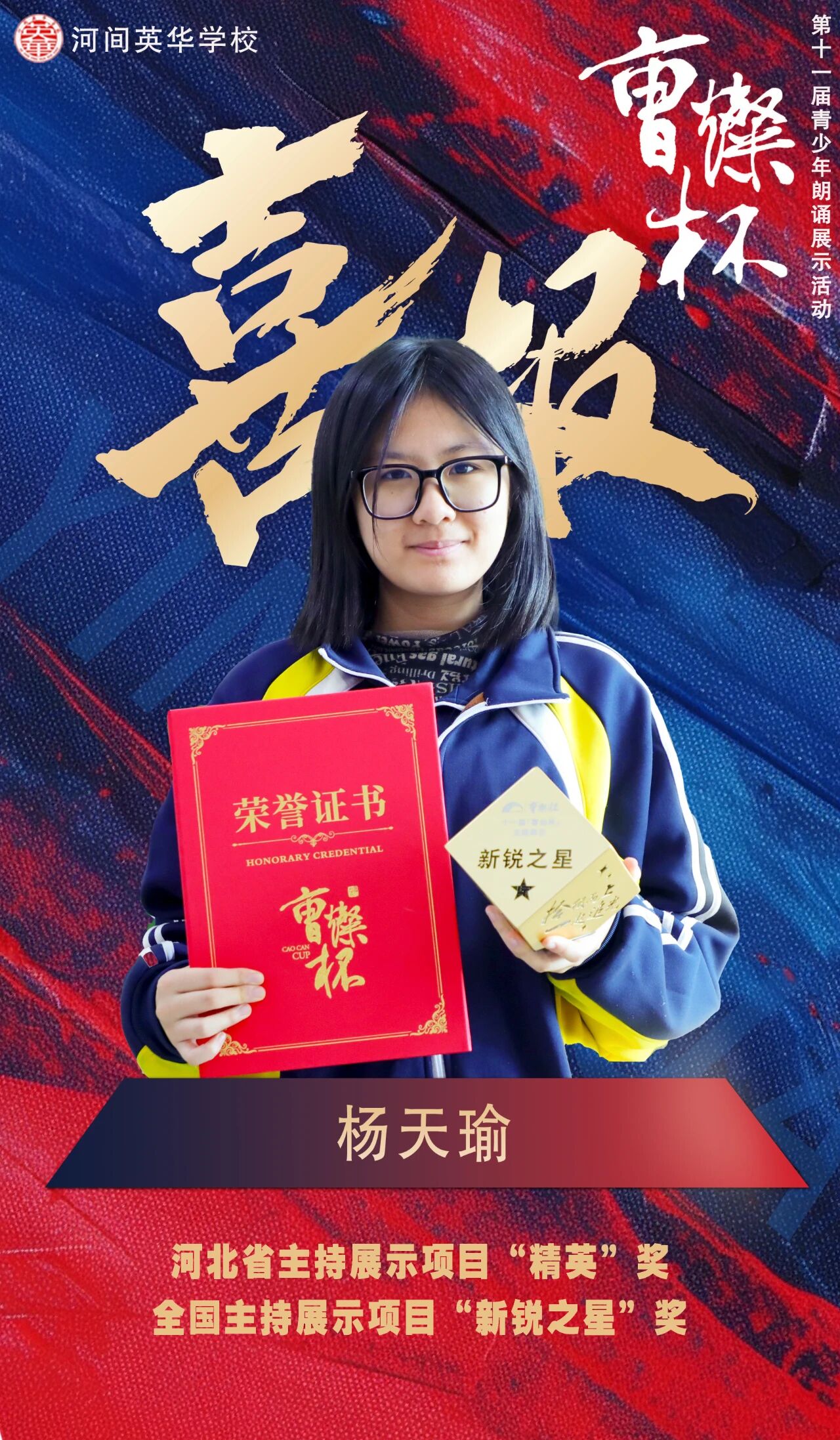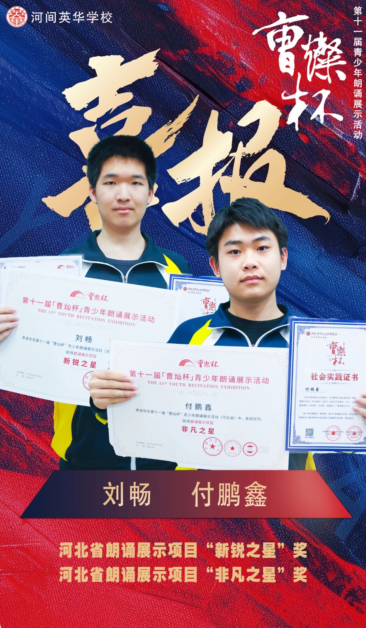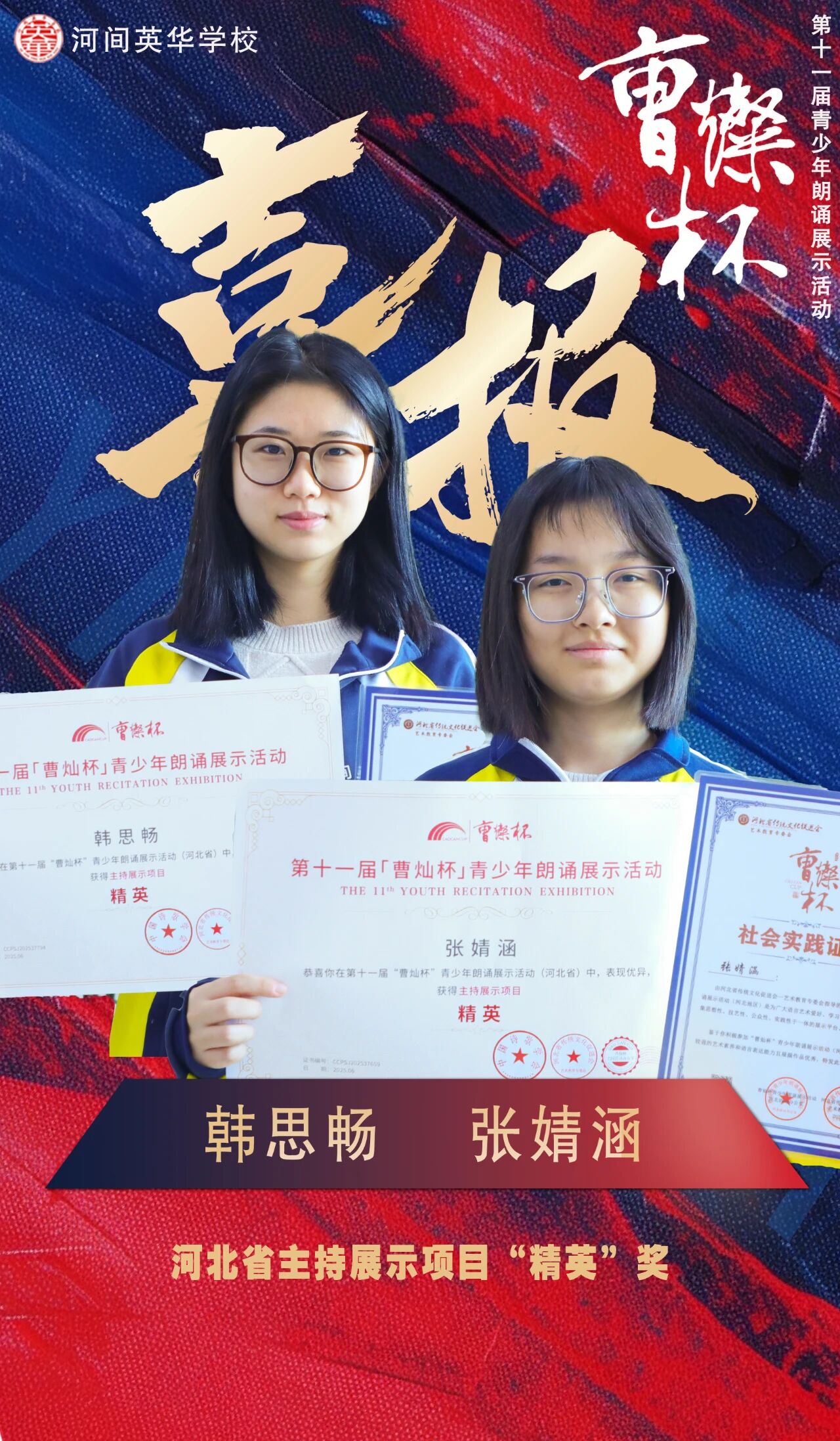 近日,被誉为“青少年语言艺术殿堂”的“曹灿杯”全国青少年朗诵展示活动,向河间英华学校传来振奋捷报!该校学子在全国数十万参