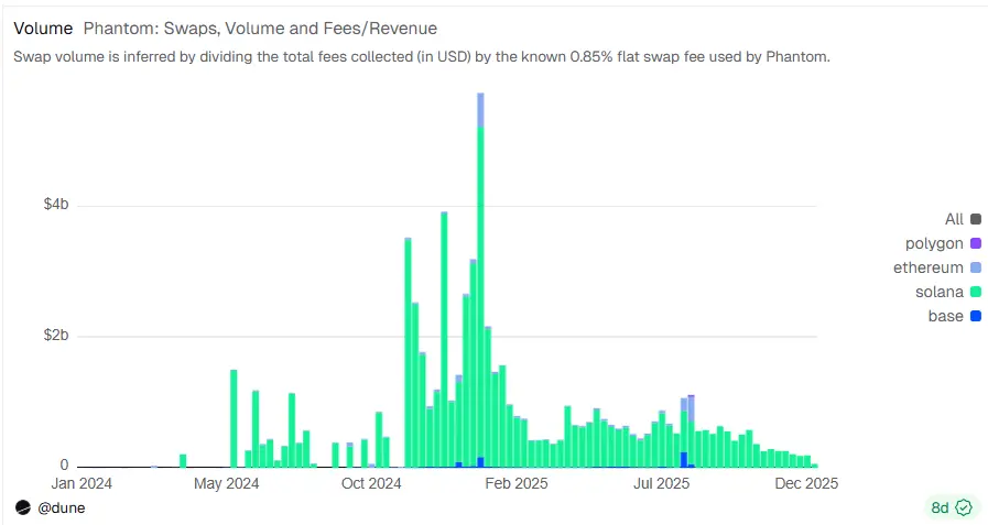然而,交易量端的隐忧同样突出。根据Dune Analytics数据,Phantom在全网嵌入式swap市场的份额从年初接近10%,5月跌至2.3%,年底进一步缩到只有0.5%。而交易所系钱包凭借费率优势、上新速度及高额空投补贴,吸引了大量高频交易用户,目前Binance Wallet占据近七成,OKX(钱包+路由API)加起来超两成。