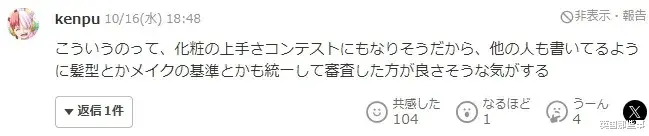 “这看起来就像是一场化妆技能大赛,所以我认为发型和化妆有统一的标准会更好。”
