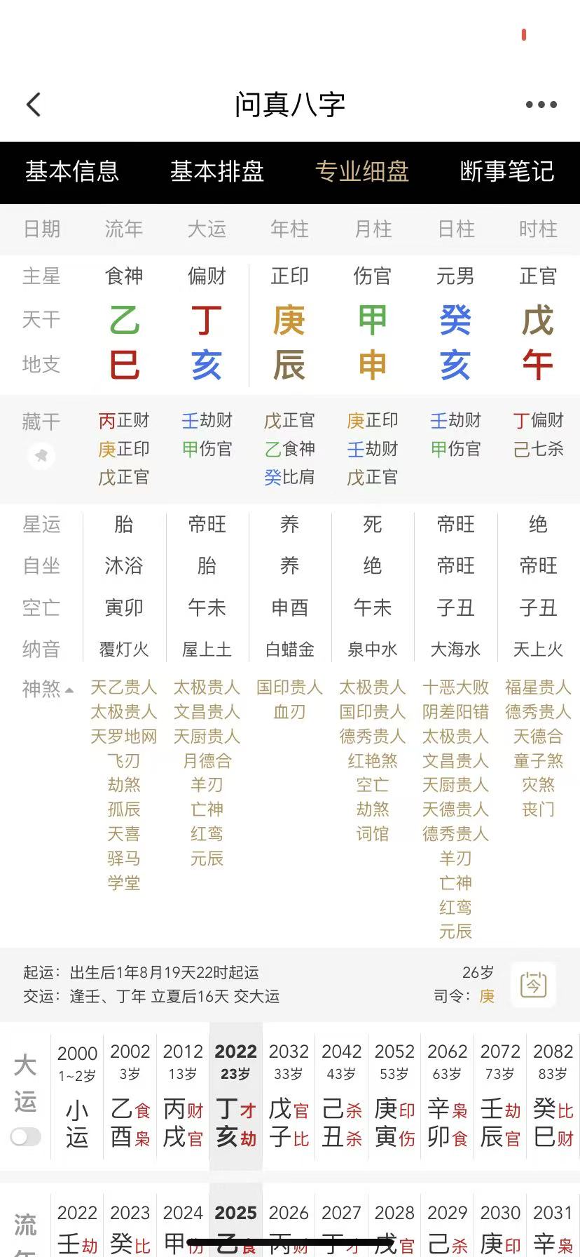 23岁-32岁走的是丁亥大运,此大运天干丁火被地支亥水戳脚,为劫财克财的大运,天干丁火财星透出,财星制了印星,但地支亥水来制午火财星,故运势有利有弊,有一定求职、升学的机会,但也代表竞争较大,钱财花销大,妻星透出,有遇到缘分并结婚的运气。