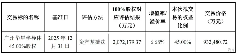 本次交易,对广州华星半导体100%股权采用资产基础法评估,估值207.22亿元,增值率6.68%。45%股权对应收购价格93.25亿元,相较于最初的投资金额,三名国资股东5年投资回报率为19.17%。