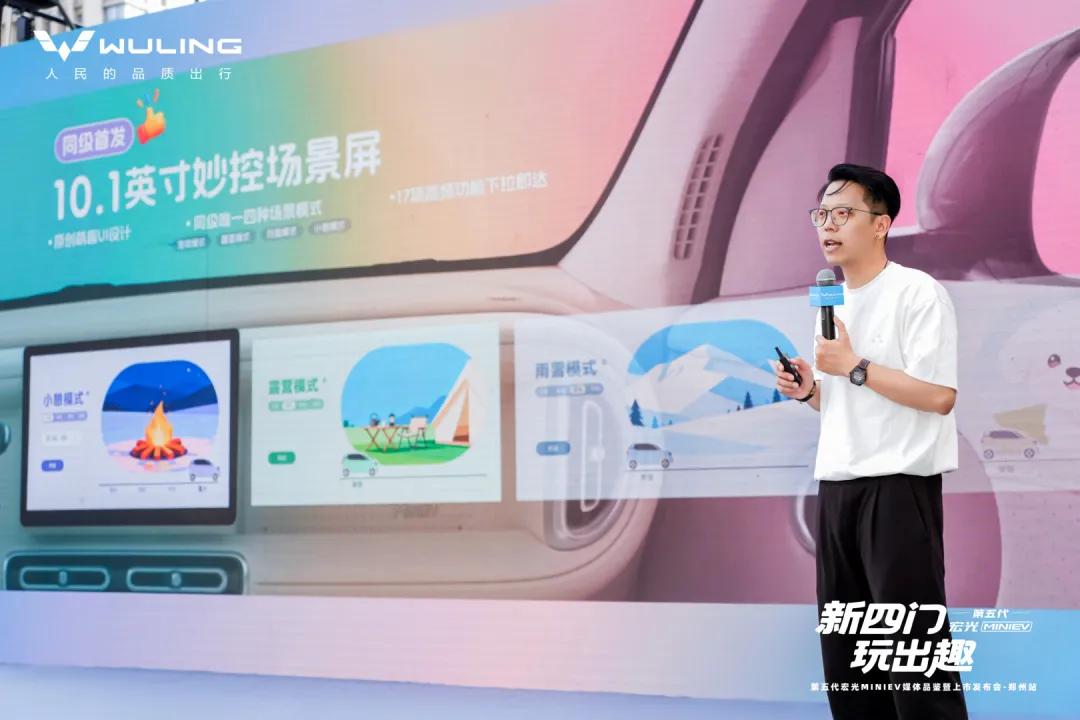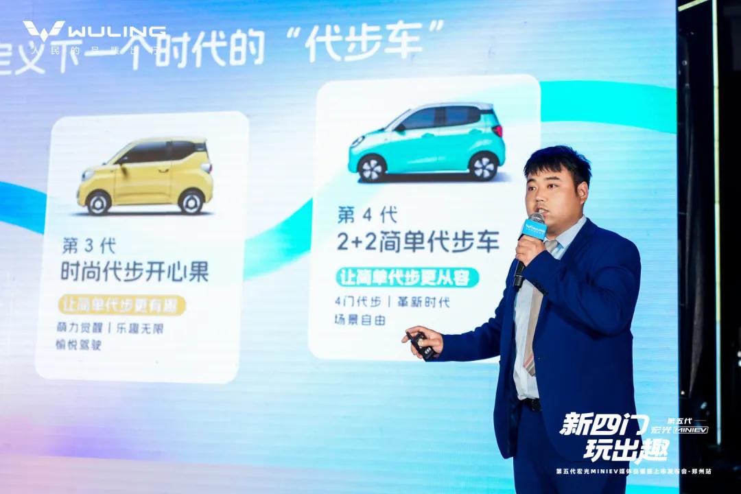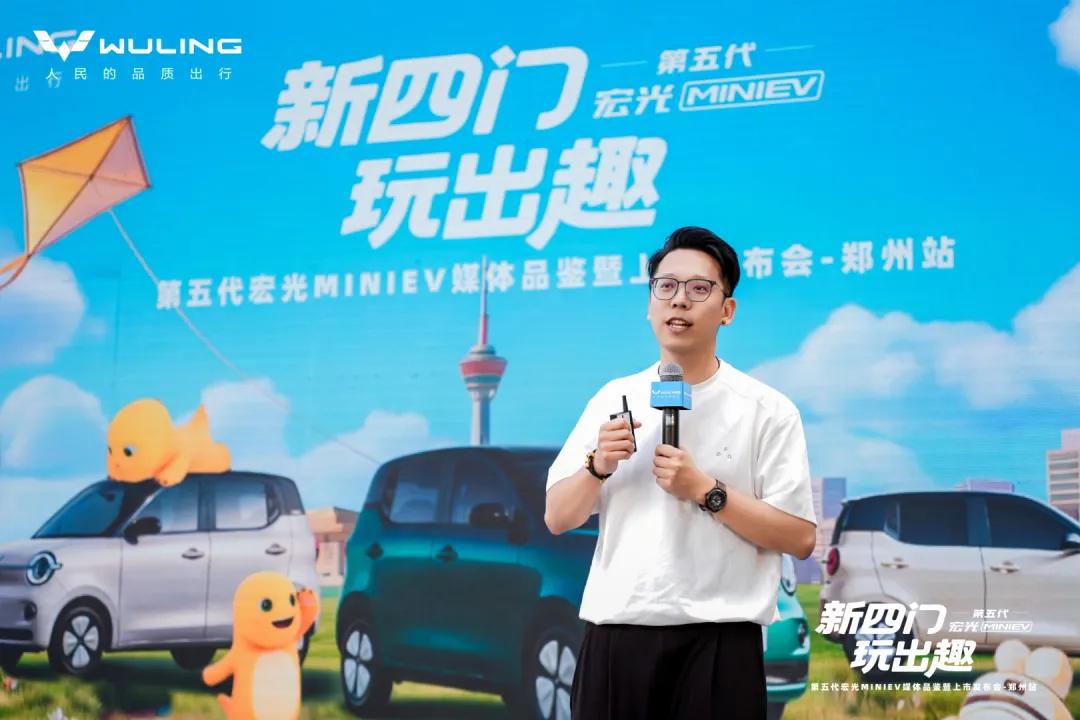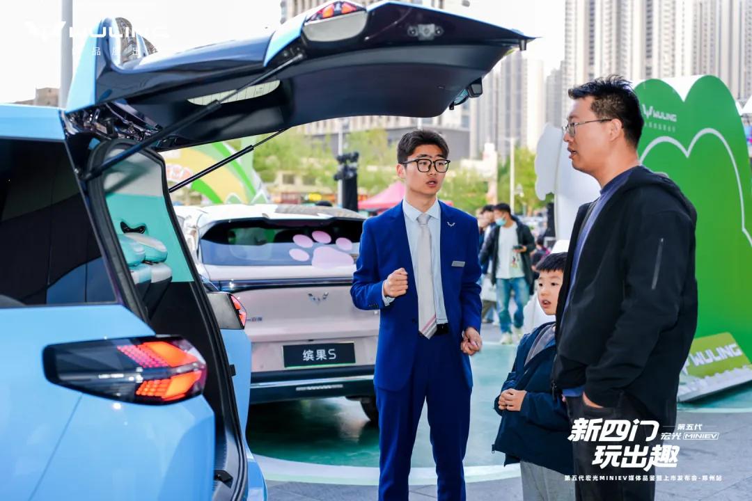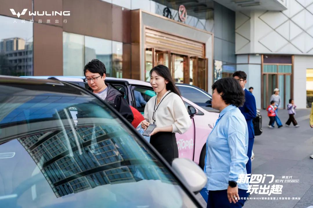 4月11日下午,郑州二七万达2号门围满了驻足围观的市民,几台配色清新的小车被幕布覆盖,有人举着手机频频拍照,低声议论“这小车看着小巧,居然是四门的”“听说不到4.3万元就能拿下”……这热闹的场景,正是第五代宏光MINIEV郑州媒体品鉴暨上市发布会的现场。